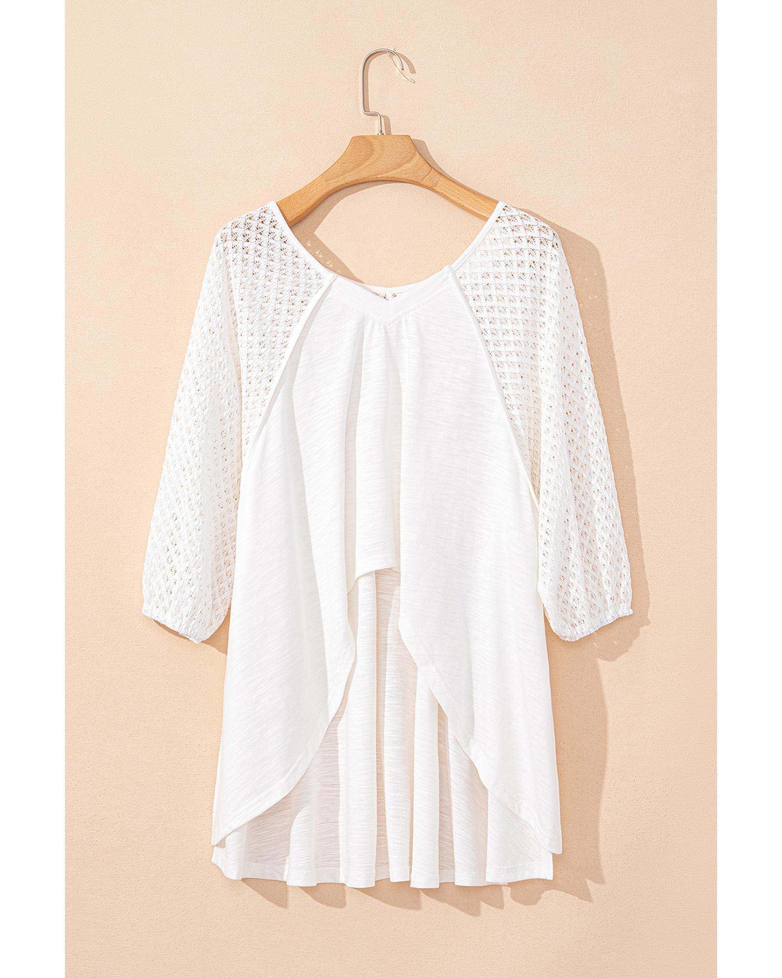 White Eyelet Patchwork High Low Hem V Neck Oversized Top – M