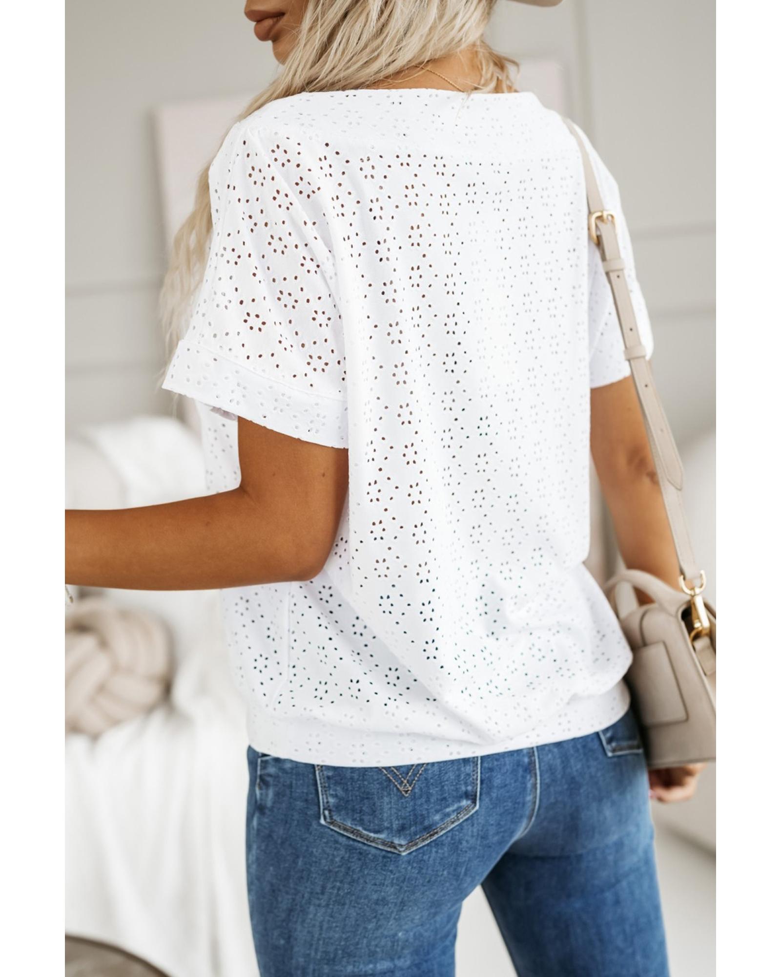 White Eyelet Pattern Boat Neck Casual Tee – L