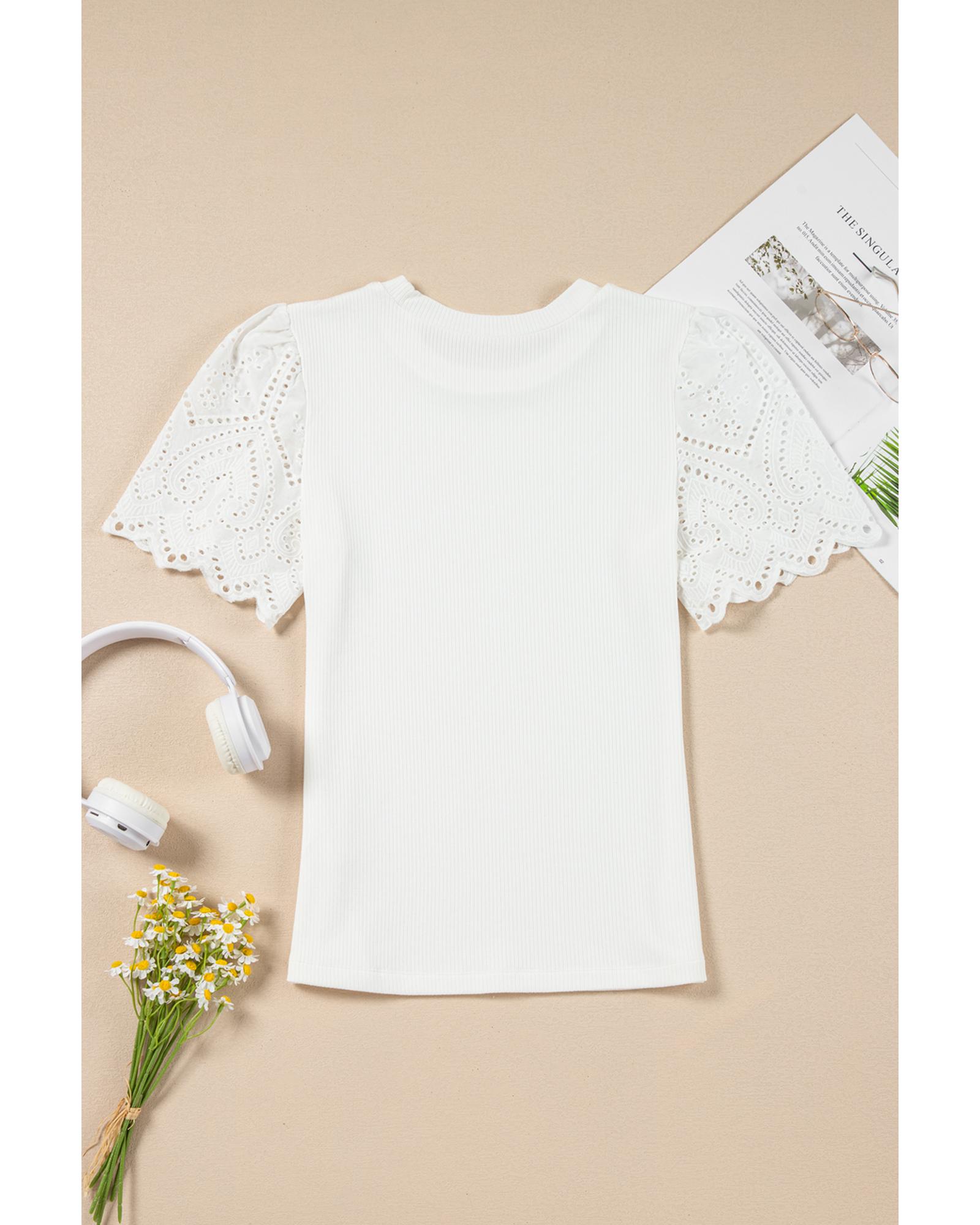 White Eyelet Pattern Short Sleeve Patchwork Ribbed Top – M