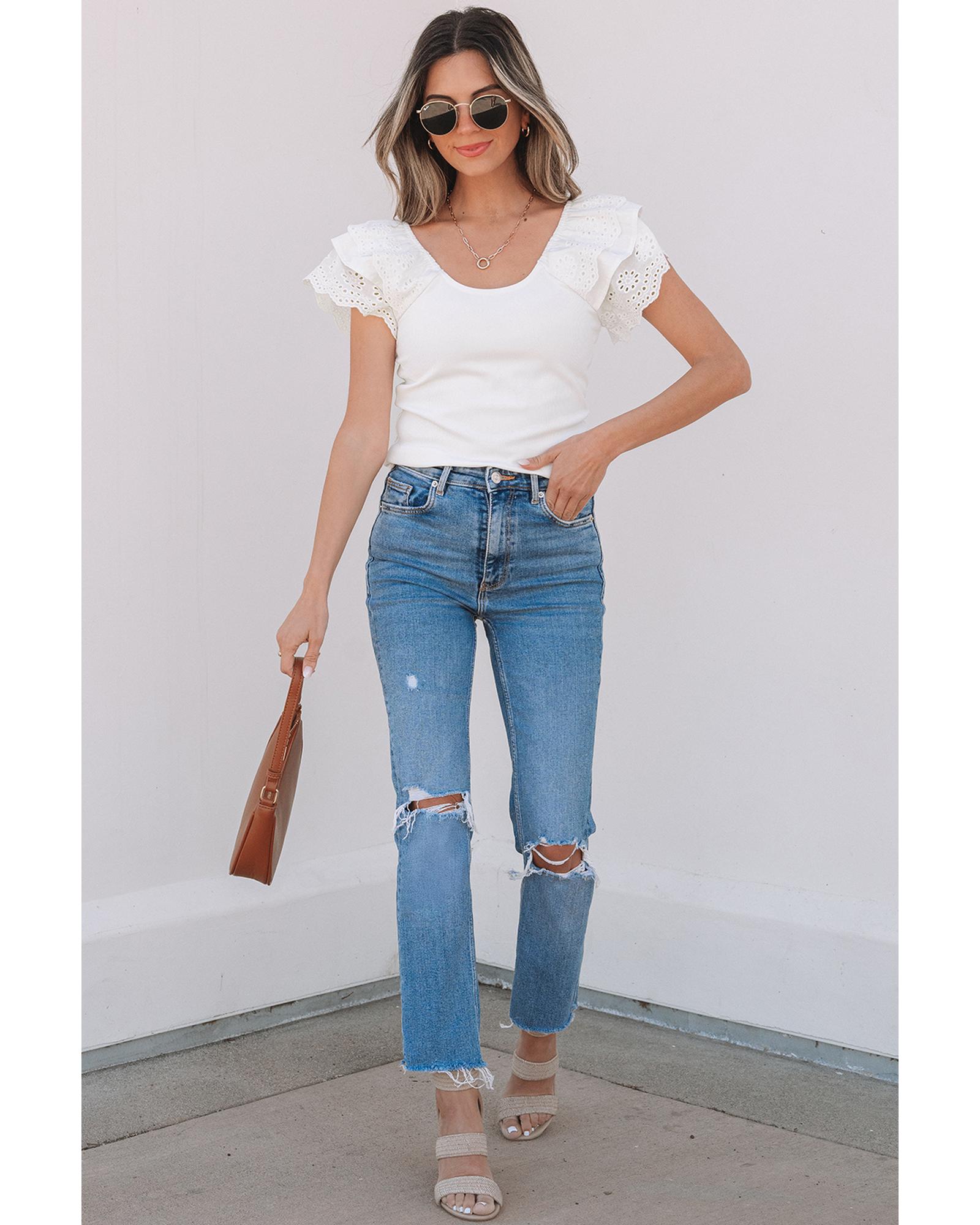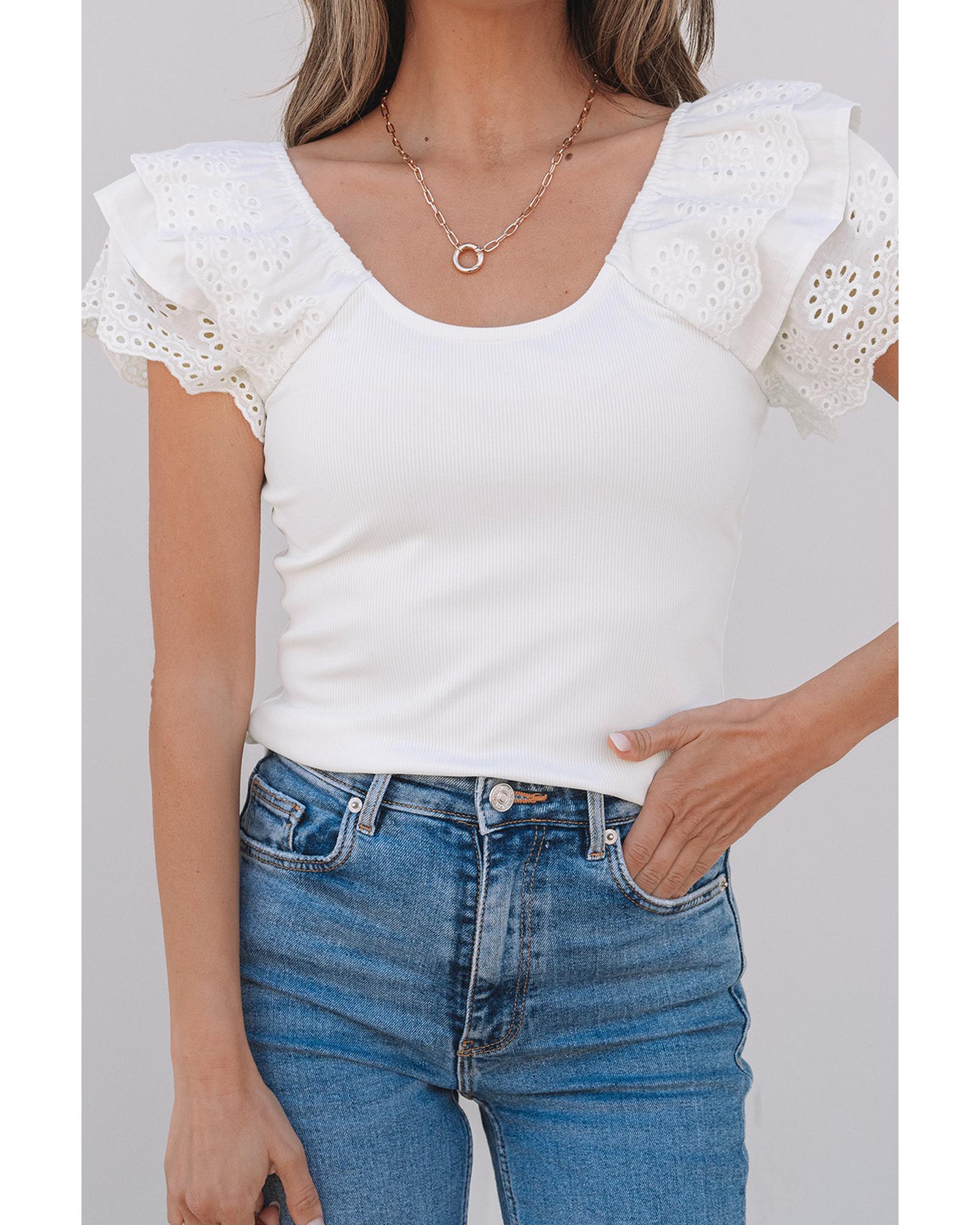 - White top with eyelet ruffle sleeve detailing