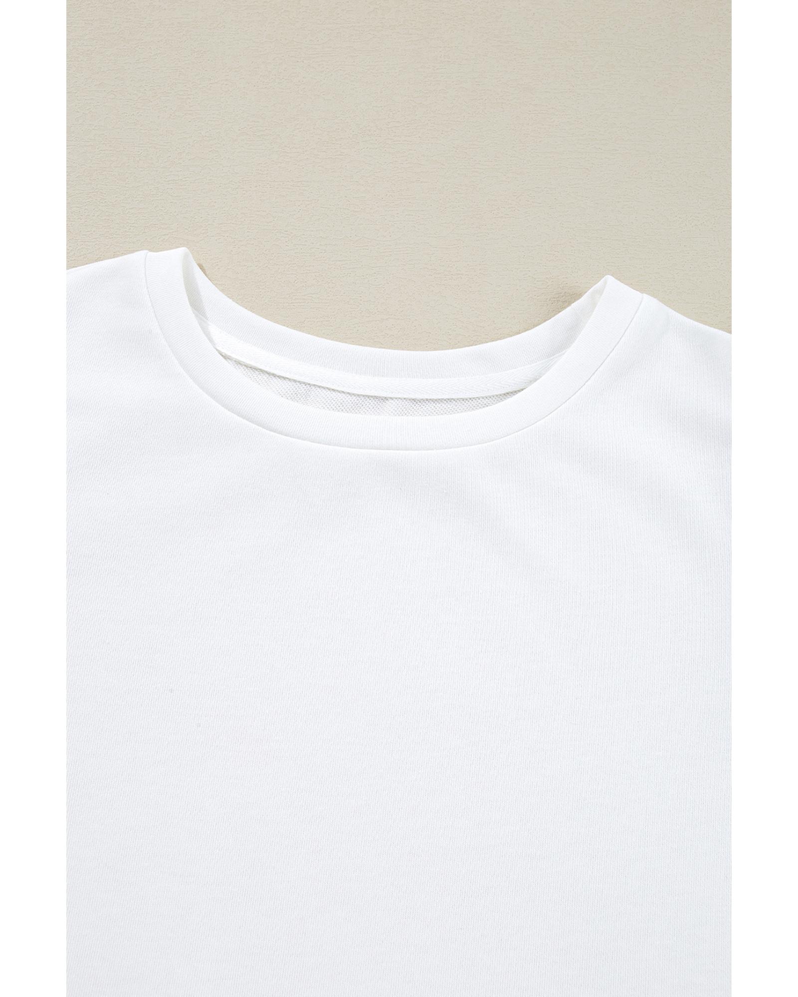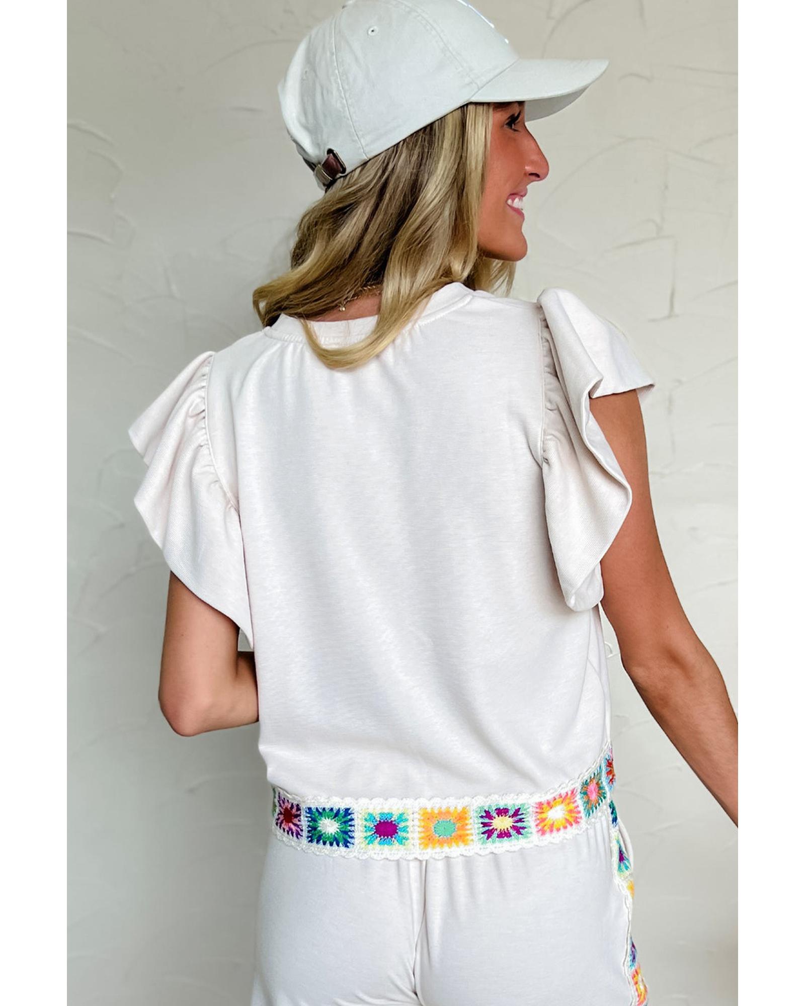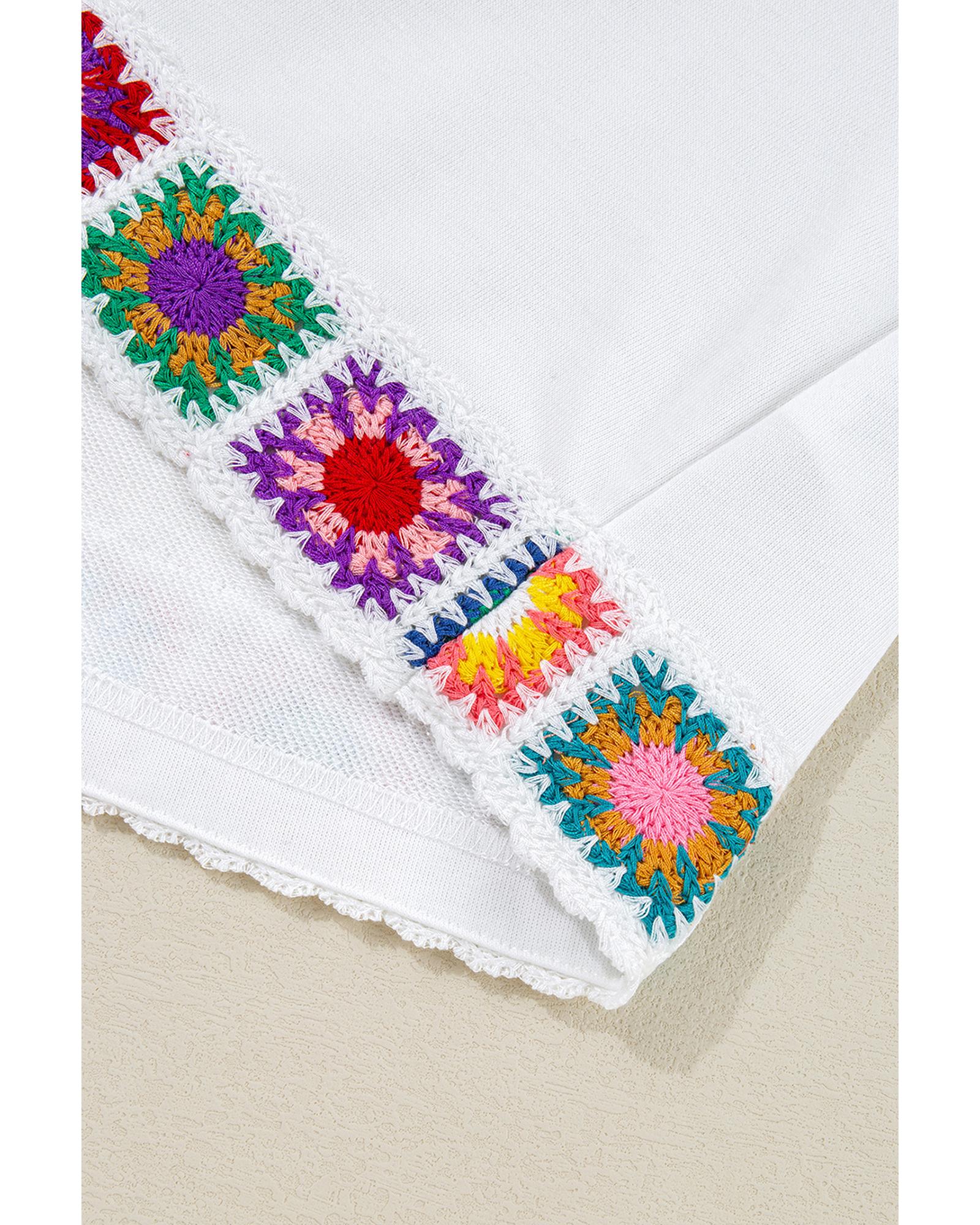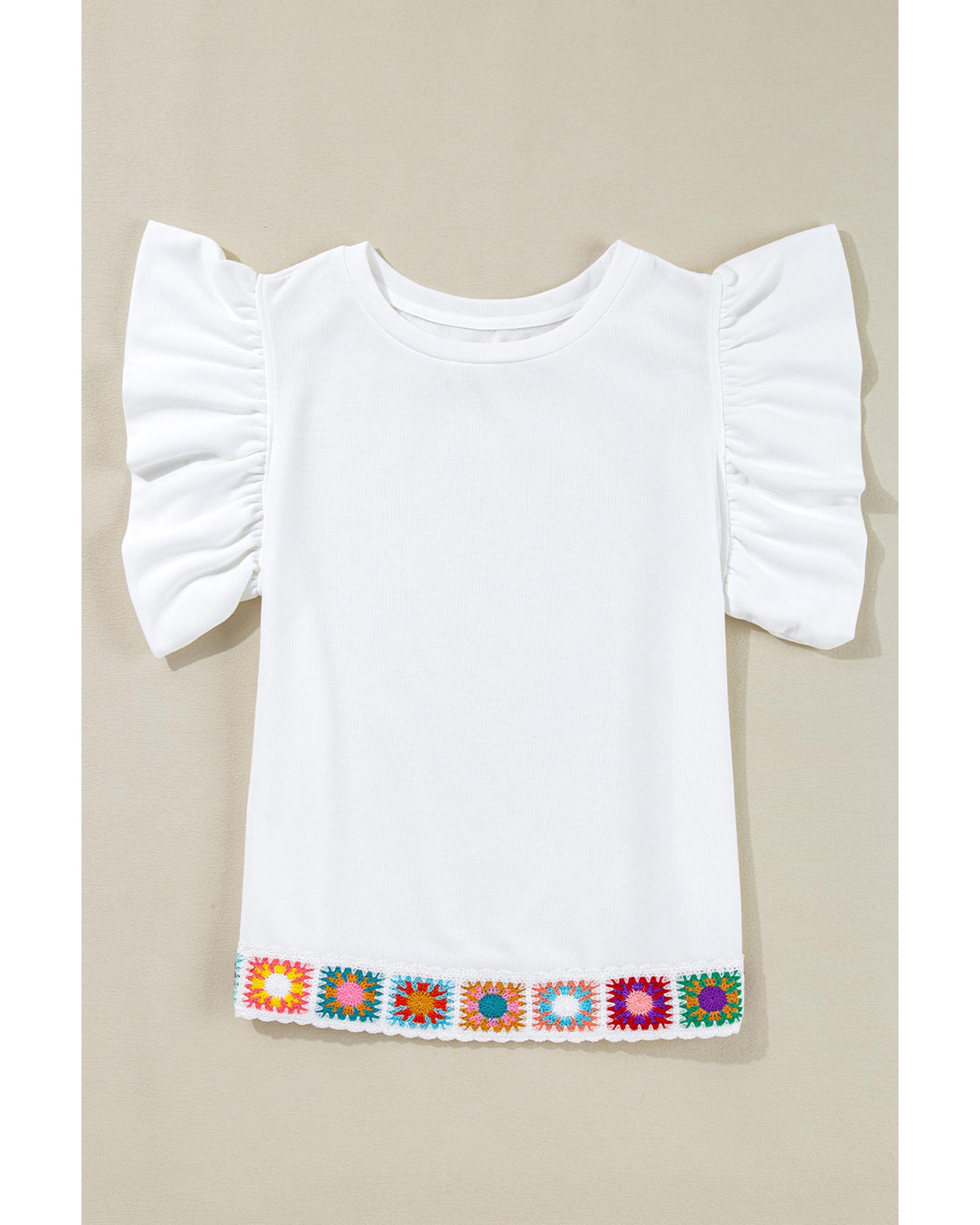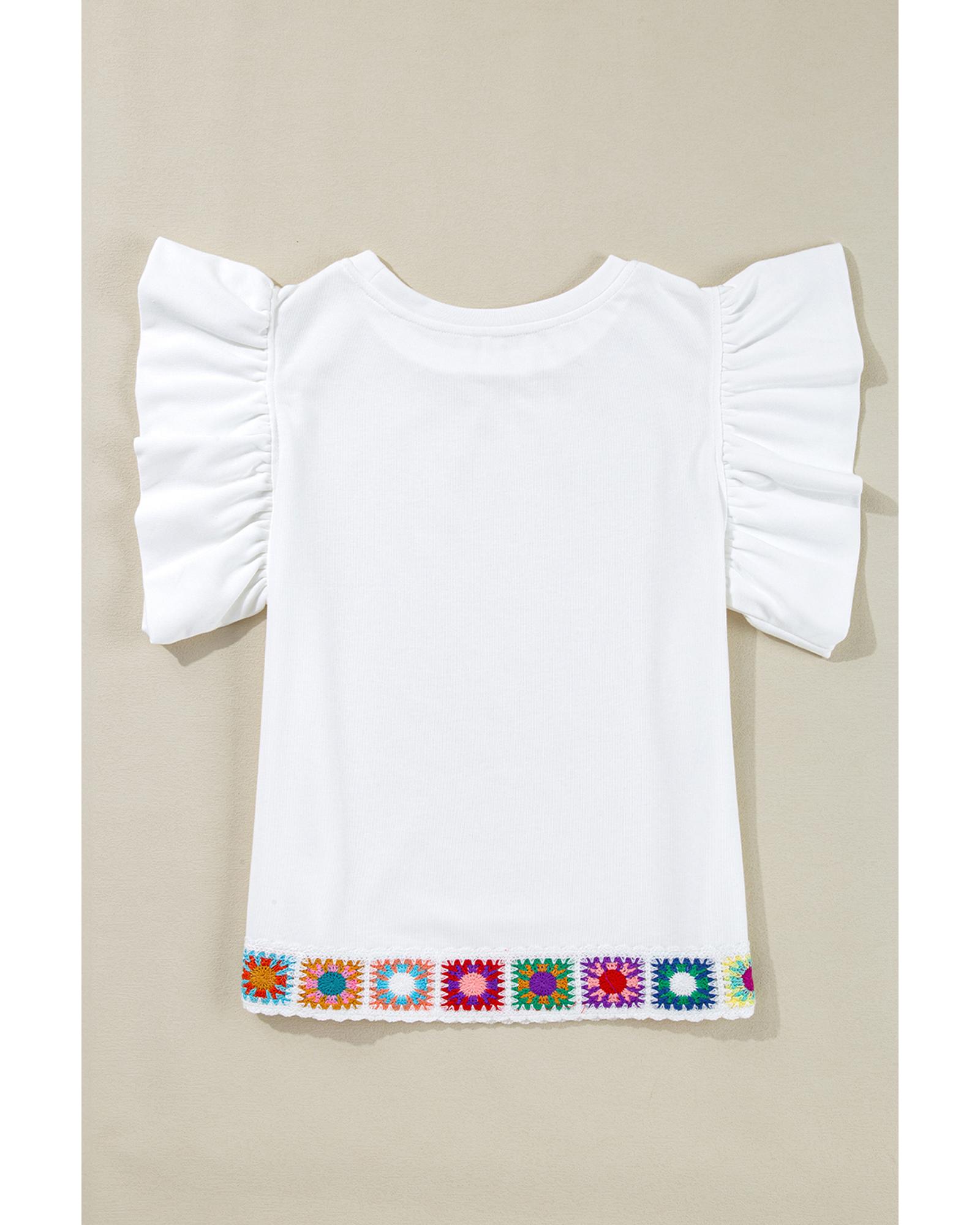 White Floral Crochet Patched Ruffled Sleeve Crewneck Blouse – S