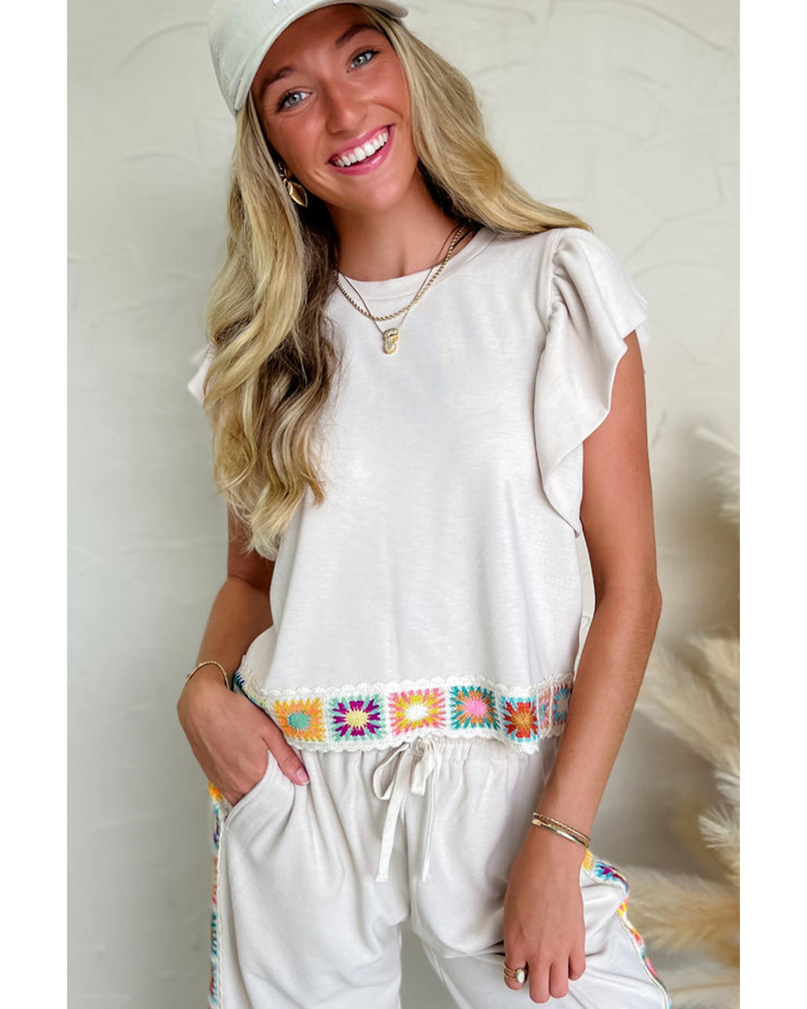White Floral Crochet Patched Ruffled Sleeve Crewneck Blouse – XL