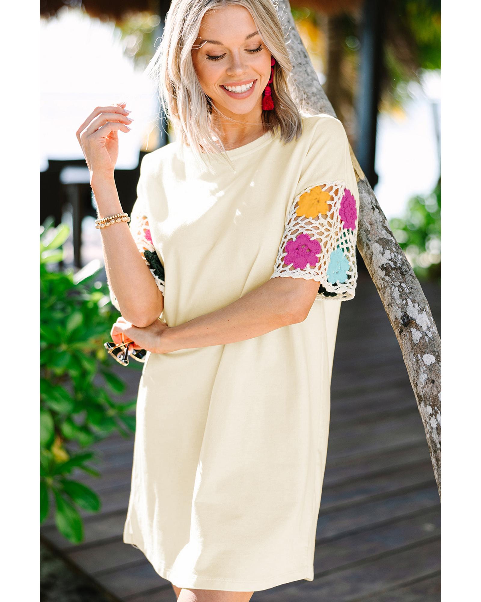 White Floral Crochet Splicing Sleeve T Shirt Dress – S