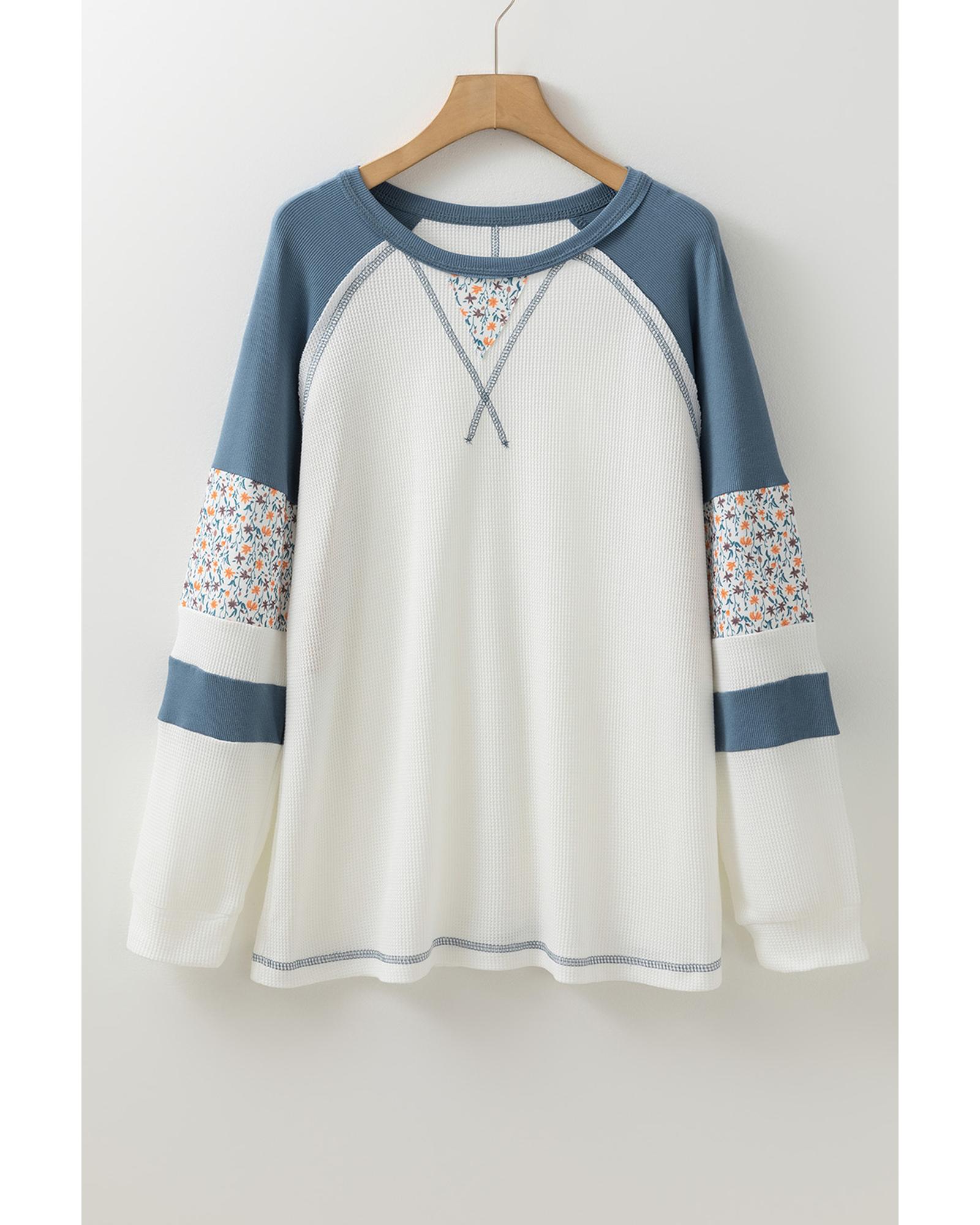 White Floral Patchwork Waffle Knit Raglan Top – L