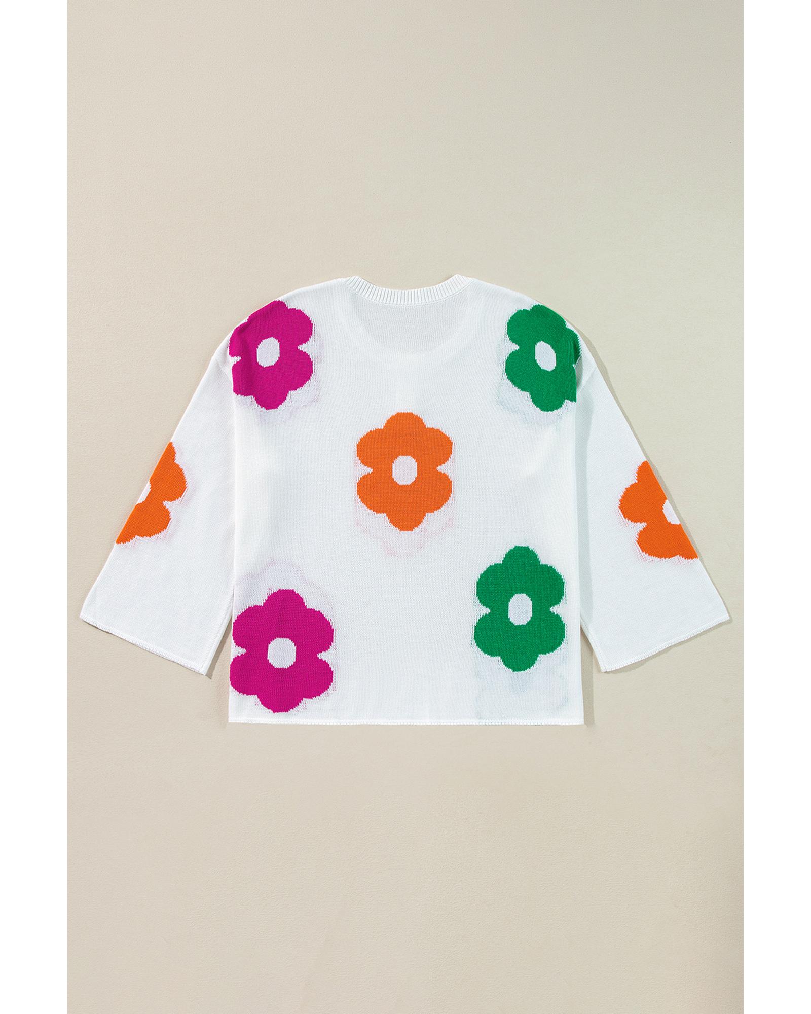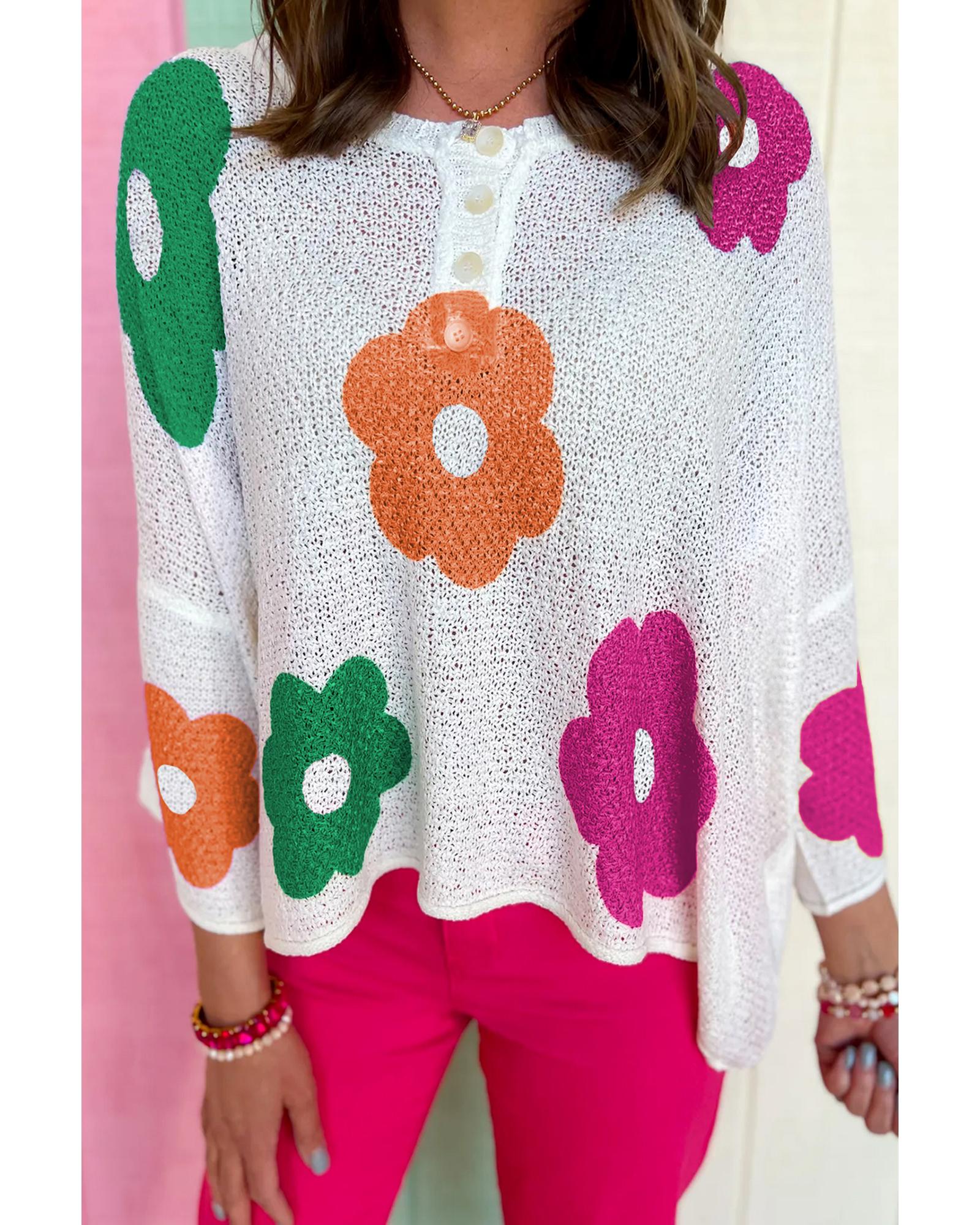 White Floral Print Buttoned Loose Lightweight Sweater – XL