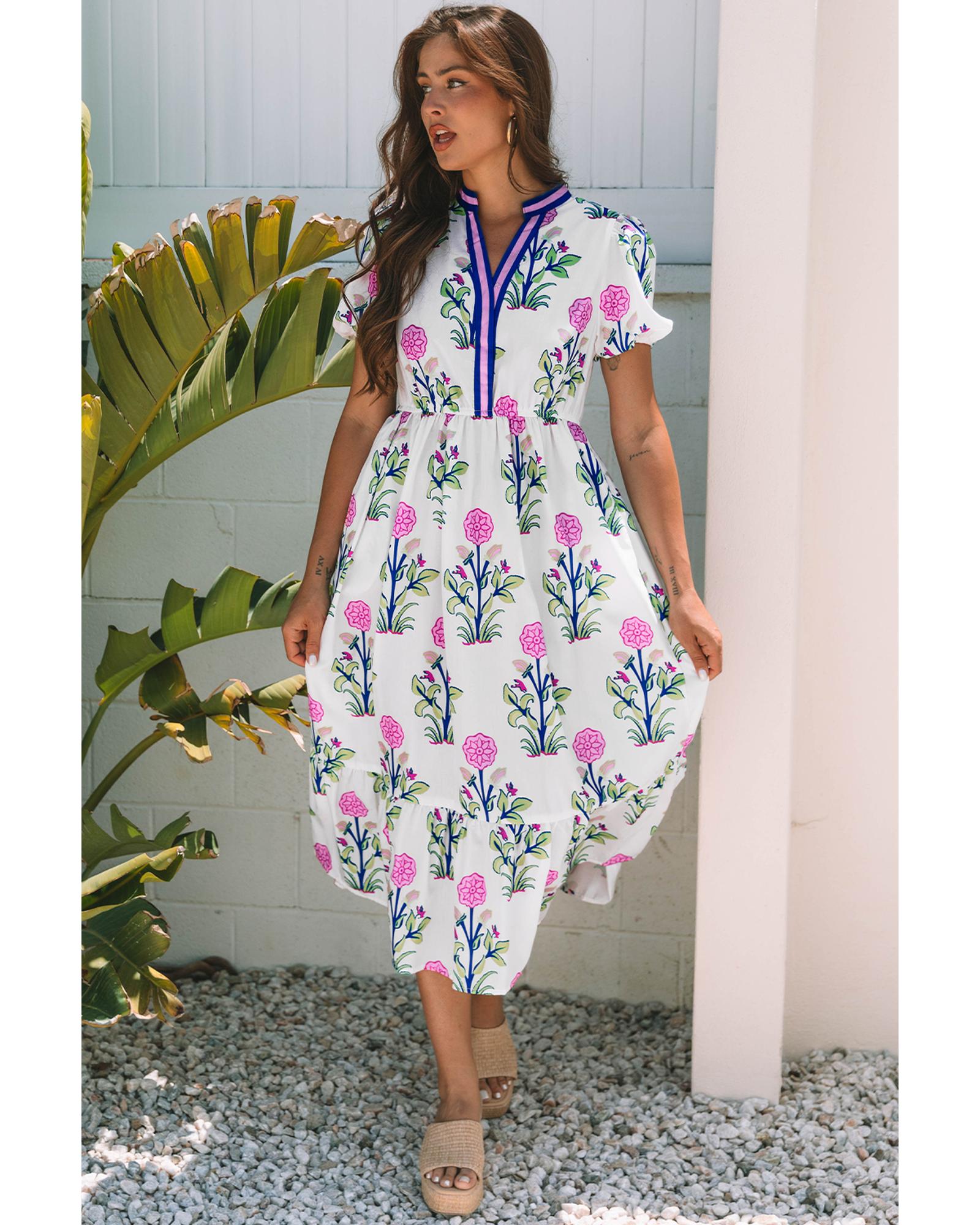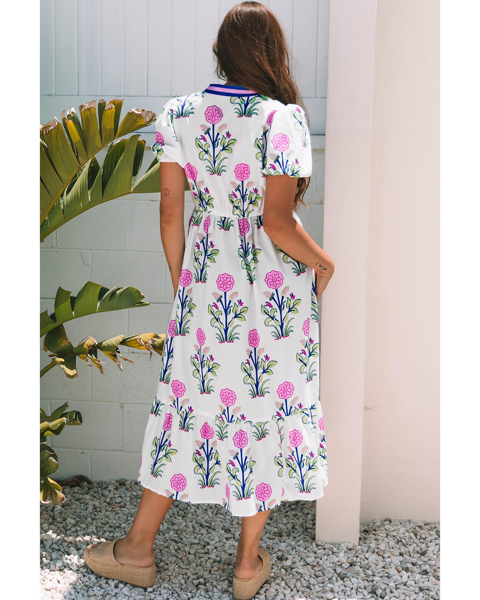 - White Floral Puff Short Sleeve V Neck High Waist Maxi Dress