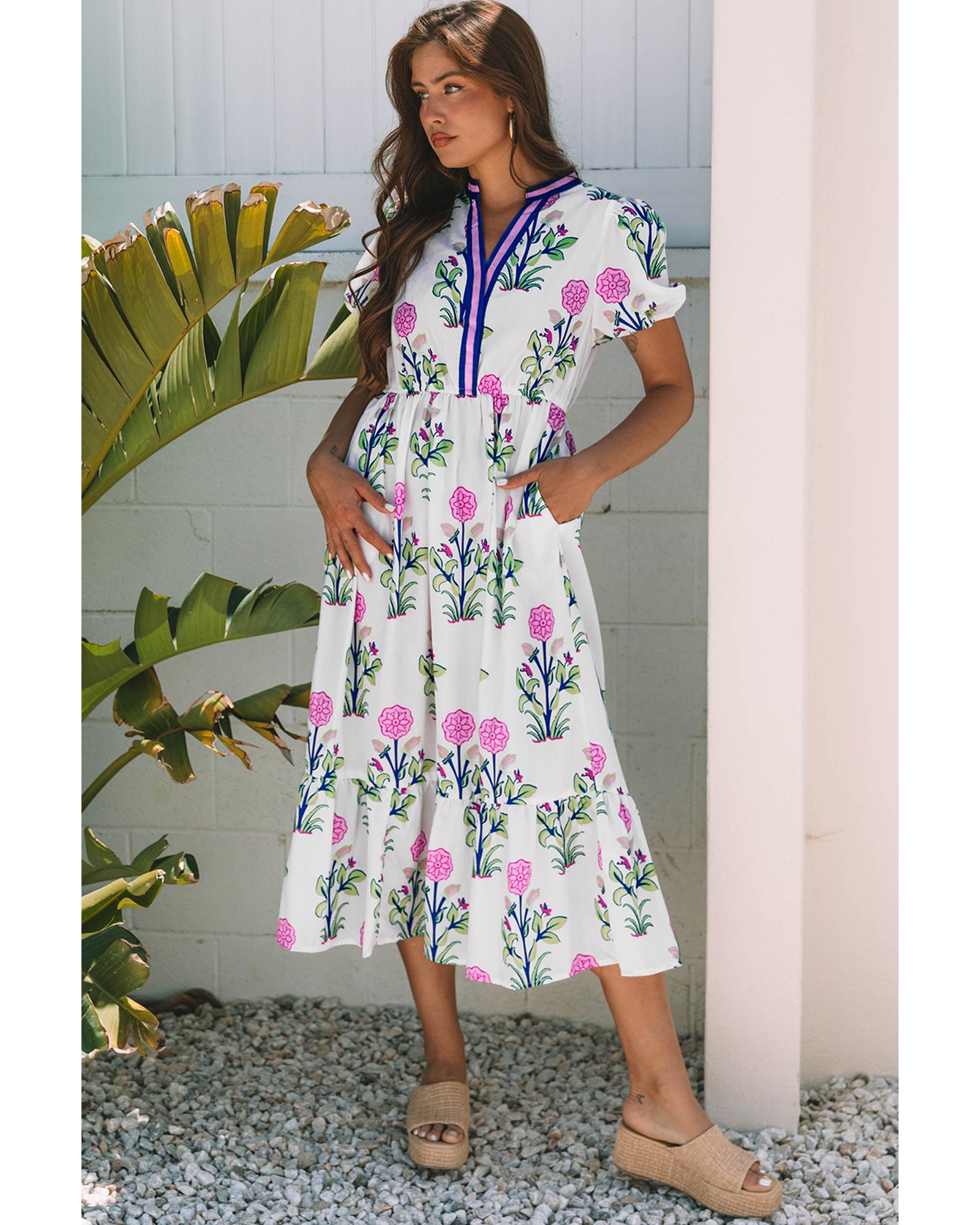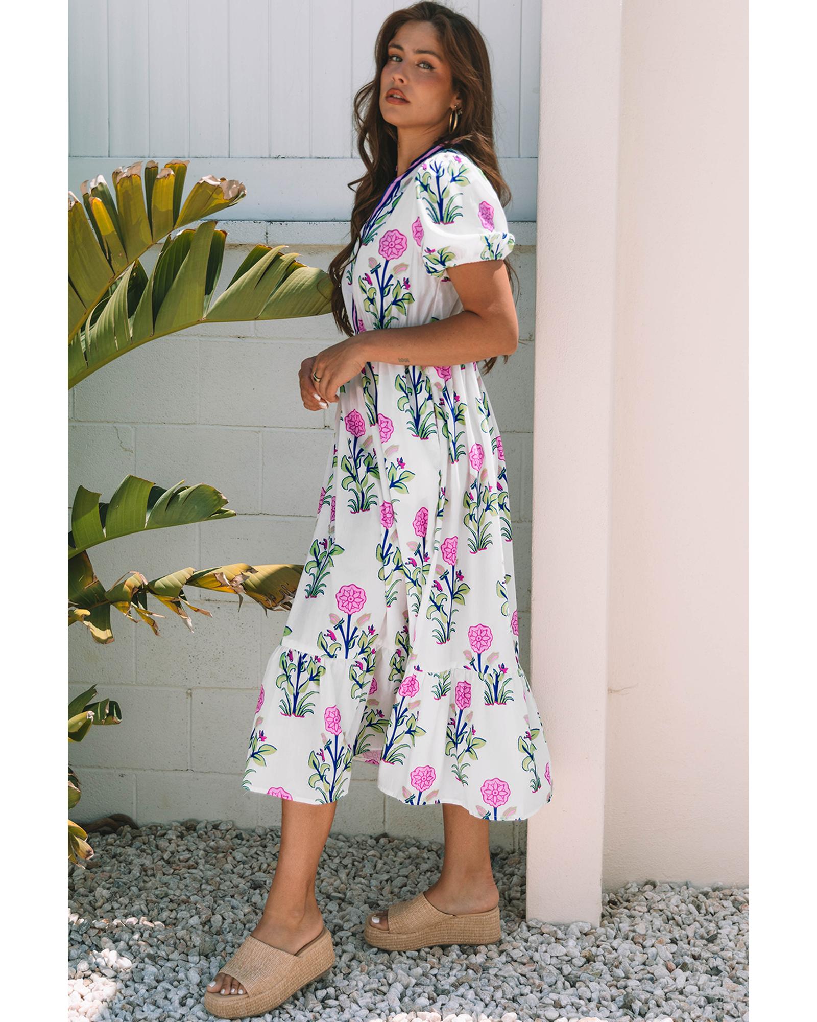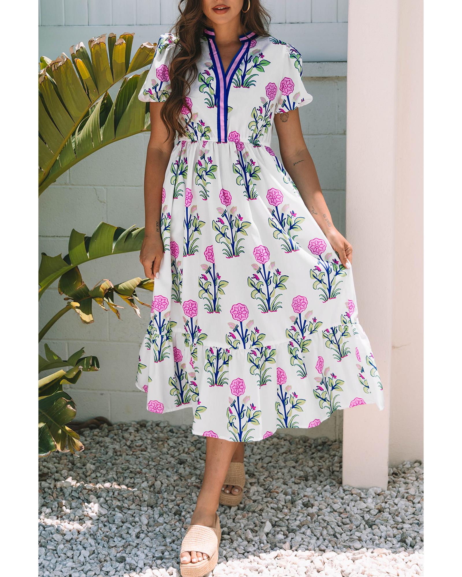 - White Floral Puff Short Sleeve V Neck High Waist Maxi Dress
