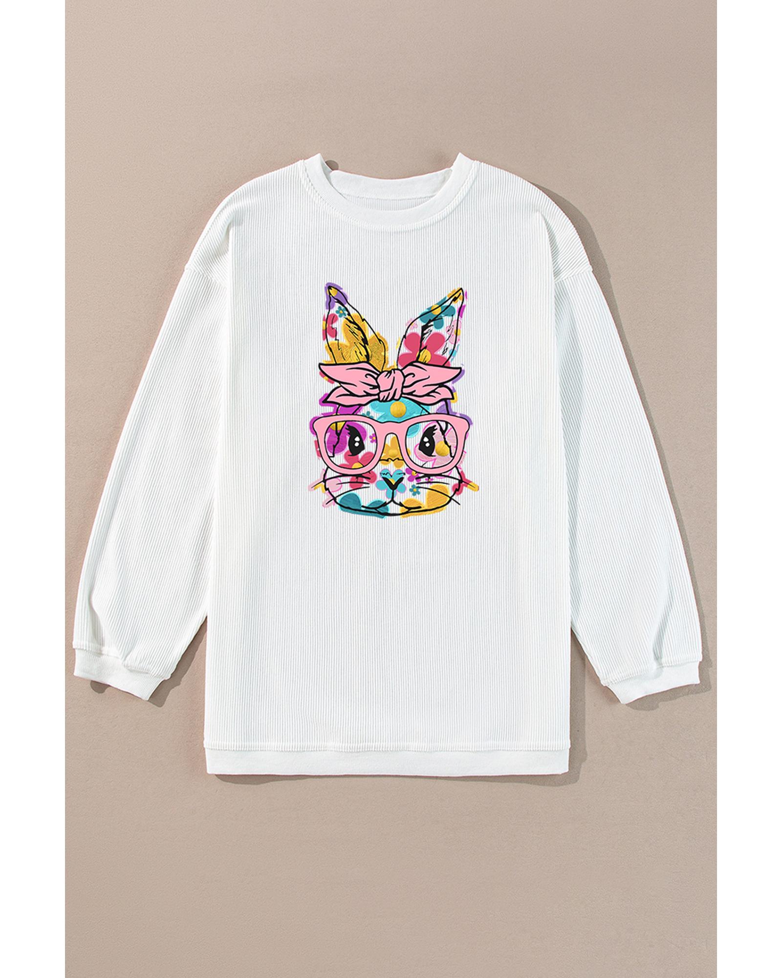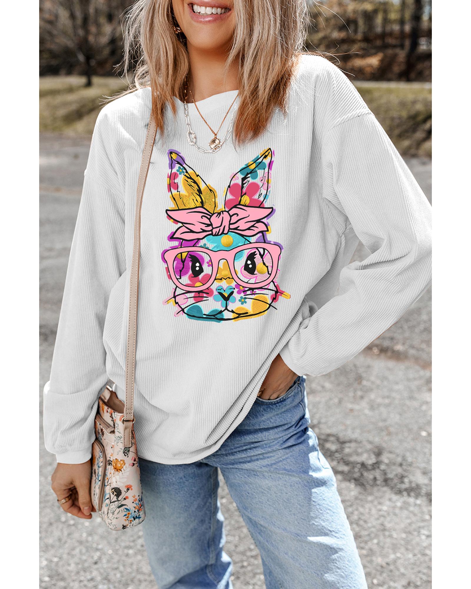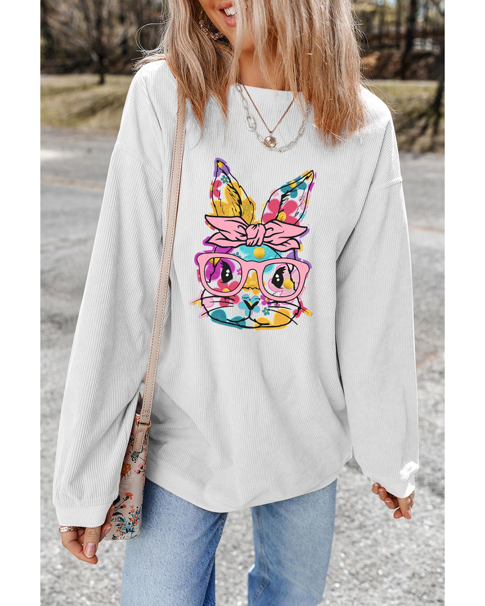 - White Floral Rabbit with Glasses Graphic Corded Easter Sweatshirt