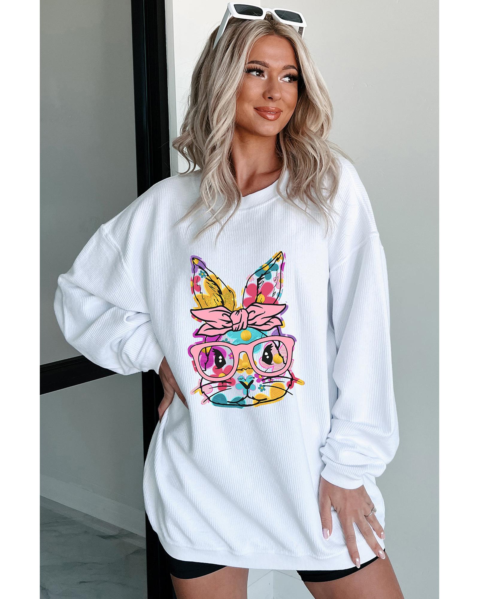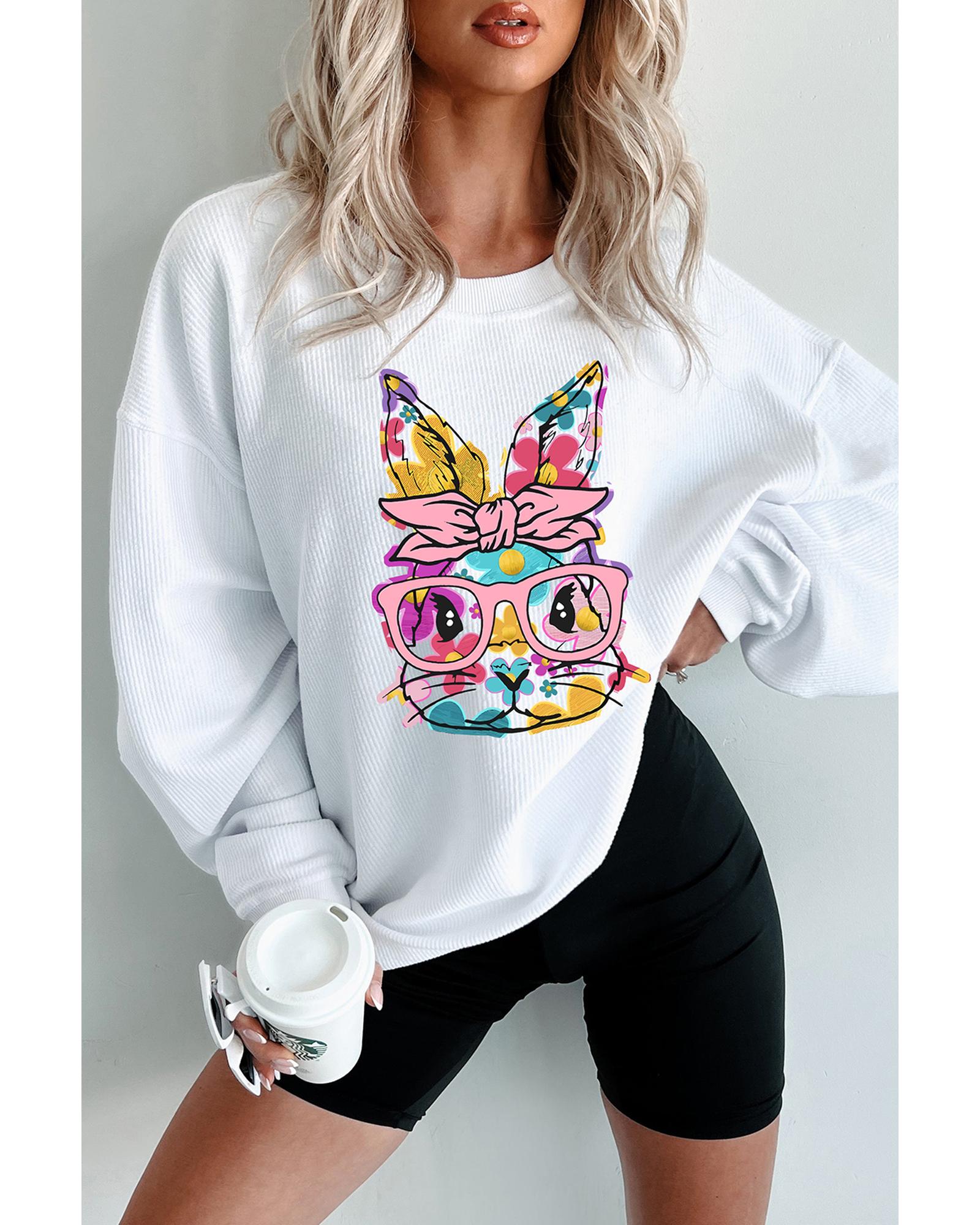 - White Floral Rabbit with Glasses Graphic Corded Easter Sweatshirt