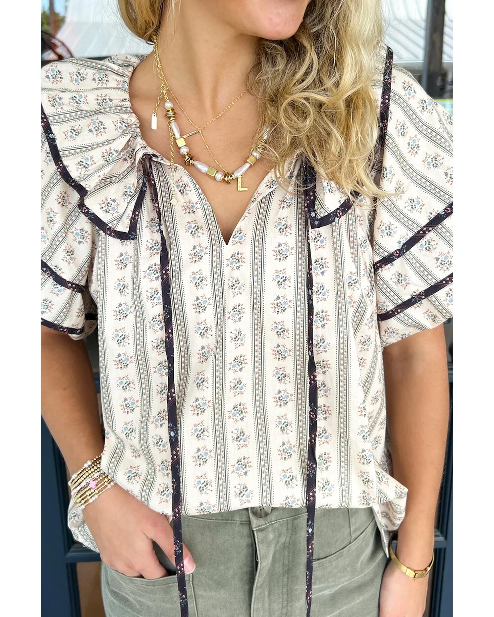 White Floral Ruffled Collar Short Puff Sleeve Printed Blouse – XL