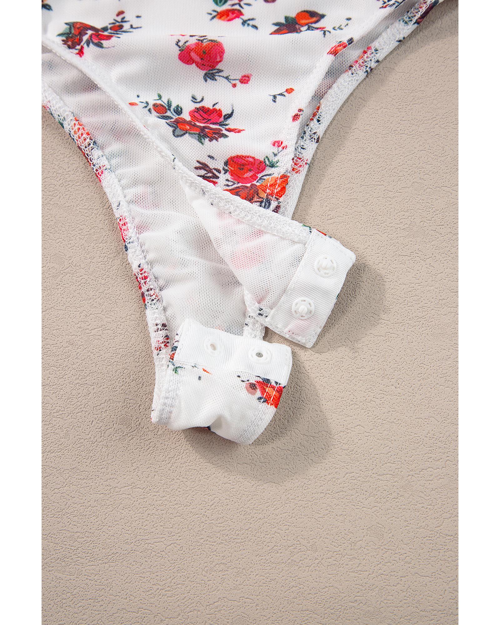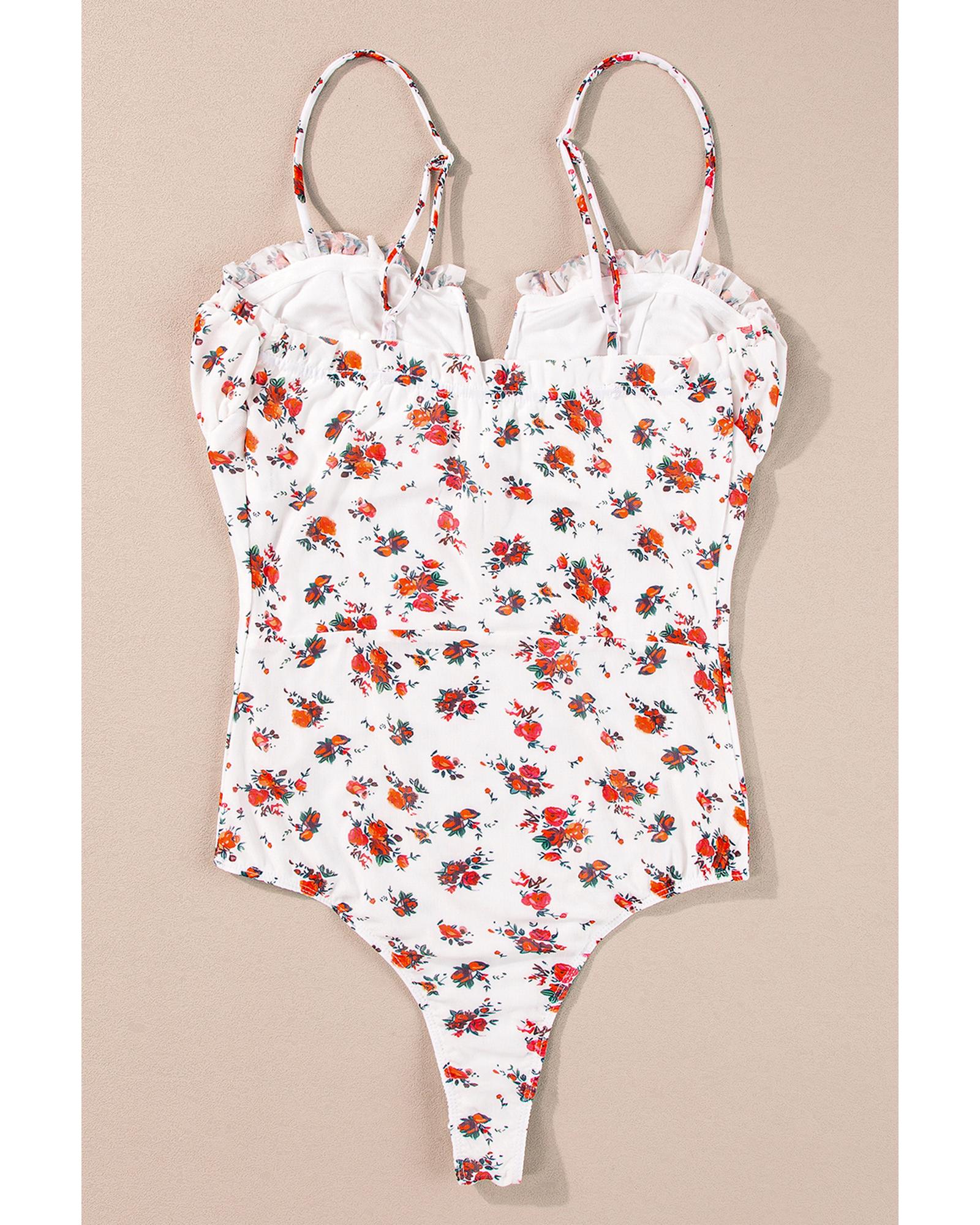 - White Floral V Cut Frilled Trim Spaghetti Straps Bodysuit