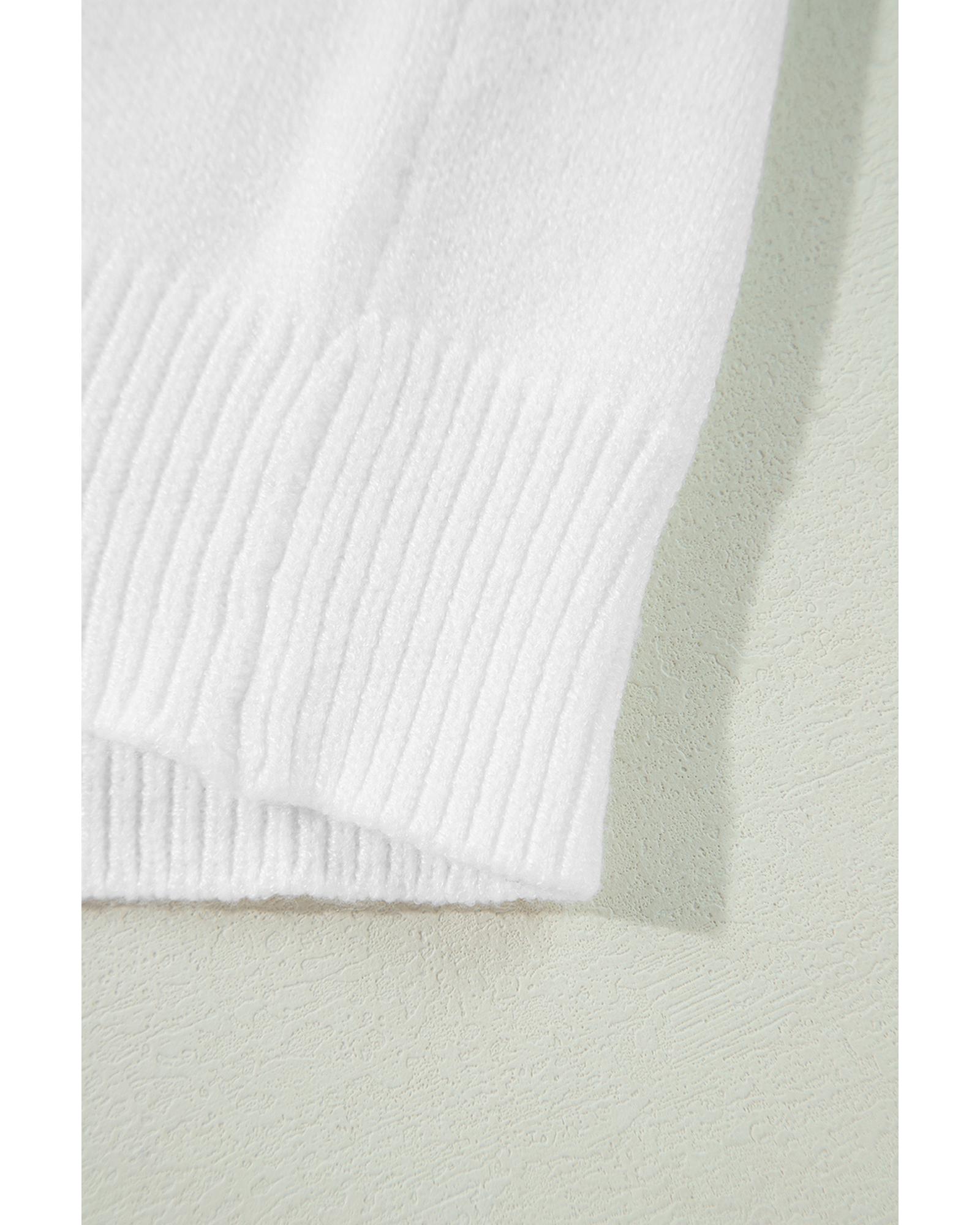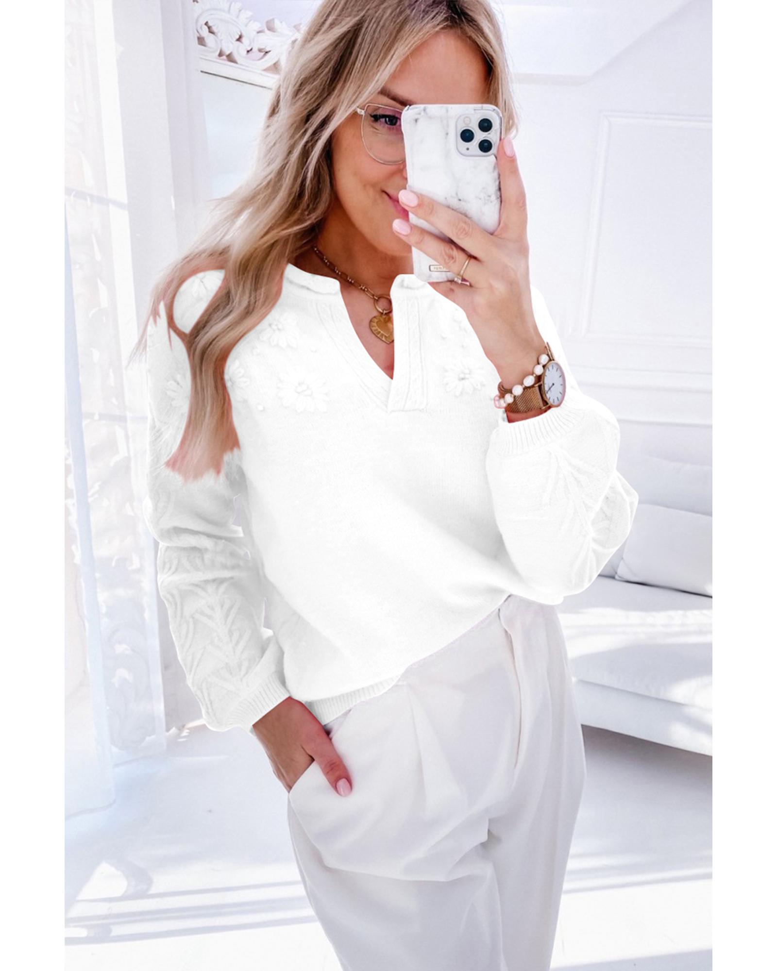 White Flower Detail Knitted Notched Neck Sweater – XL