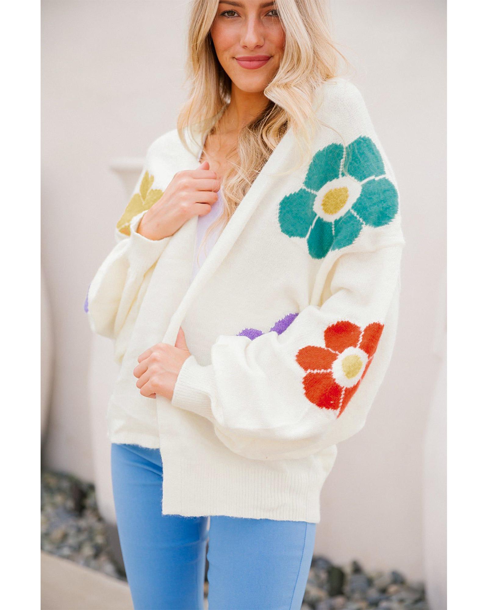 White Flower Jacquared Bubble Sleeve Open Cardigan – S