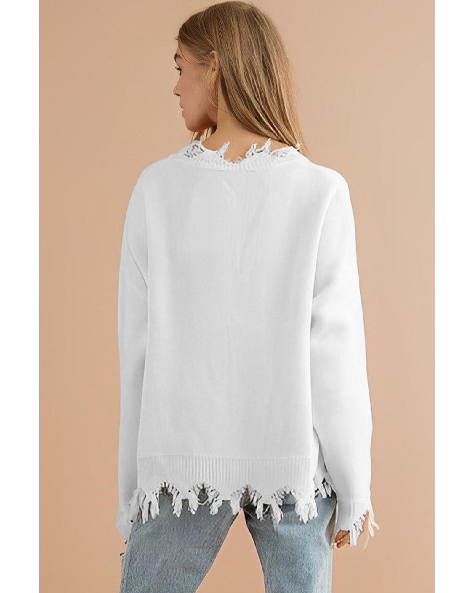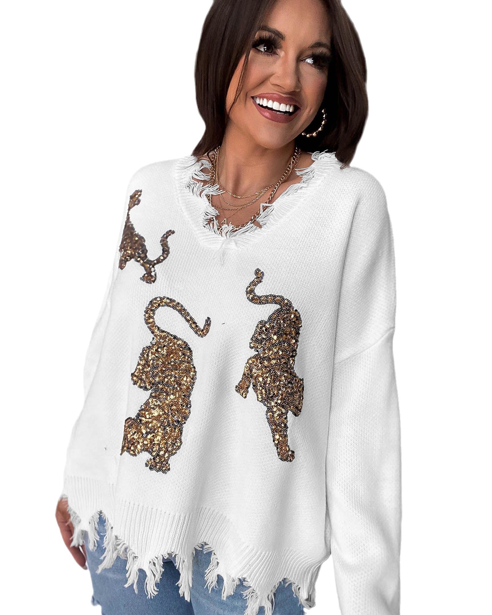 - Luxurious White Frayed Sequin Tiger Sweater