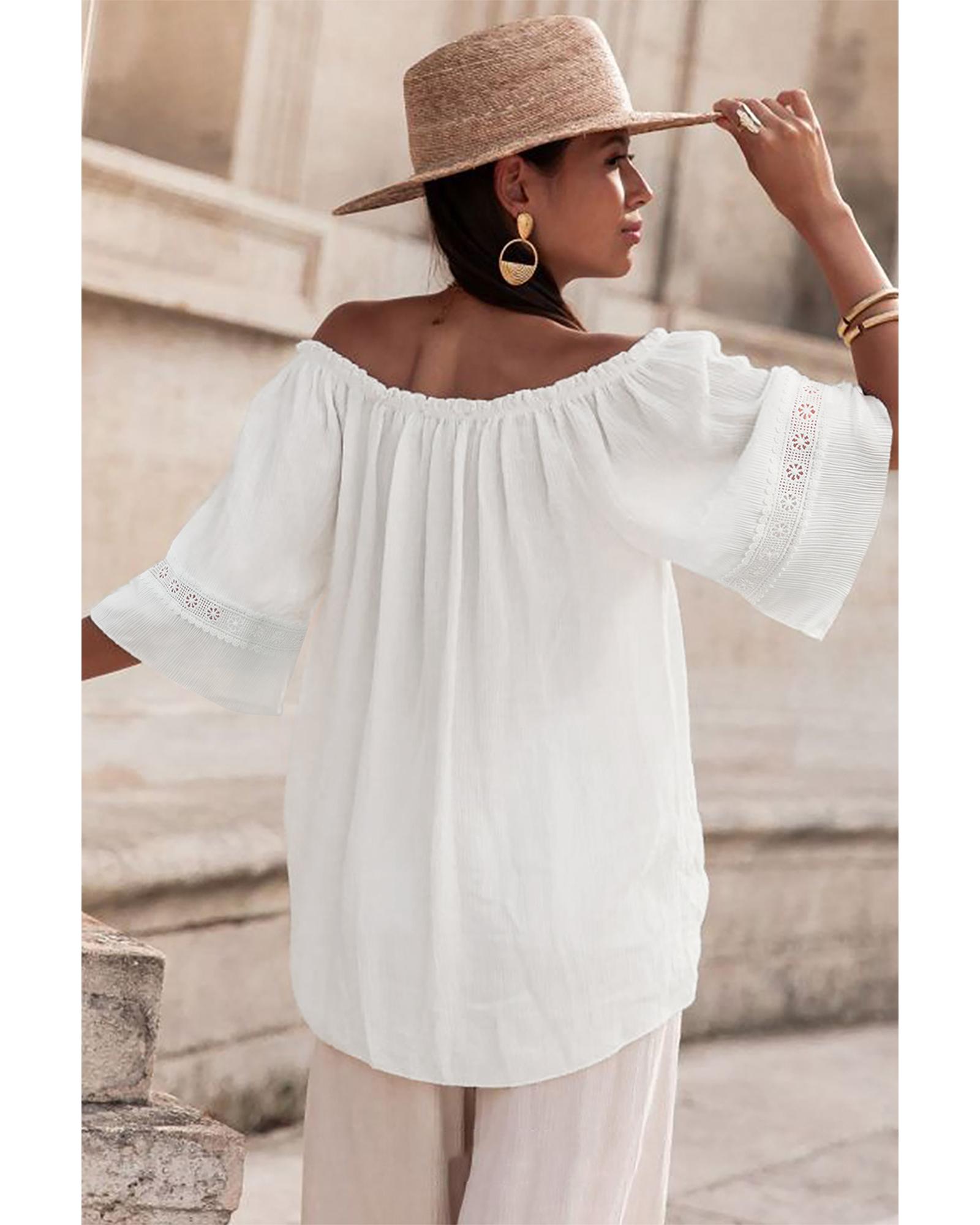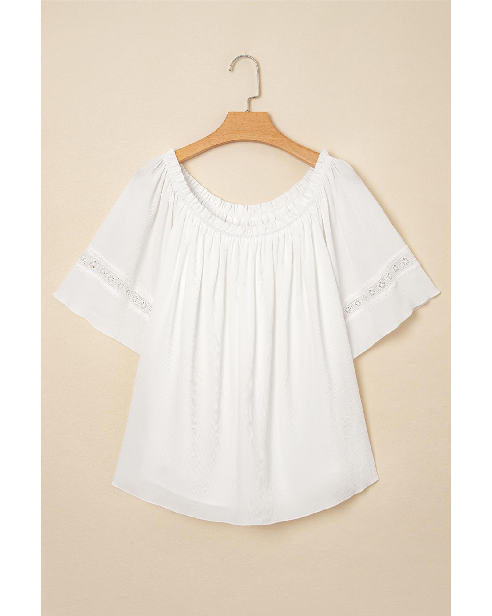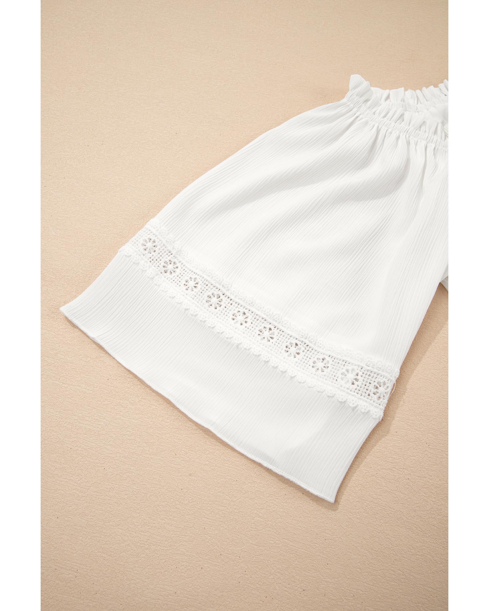 White Frilly Off Shoulder Lace Insert Sleeve Textured Blouse – S
