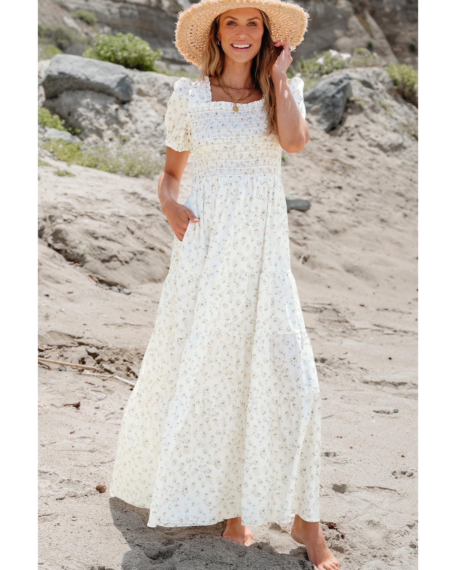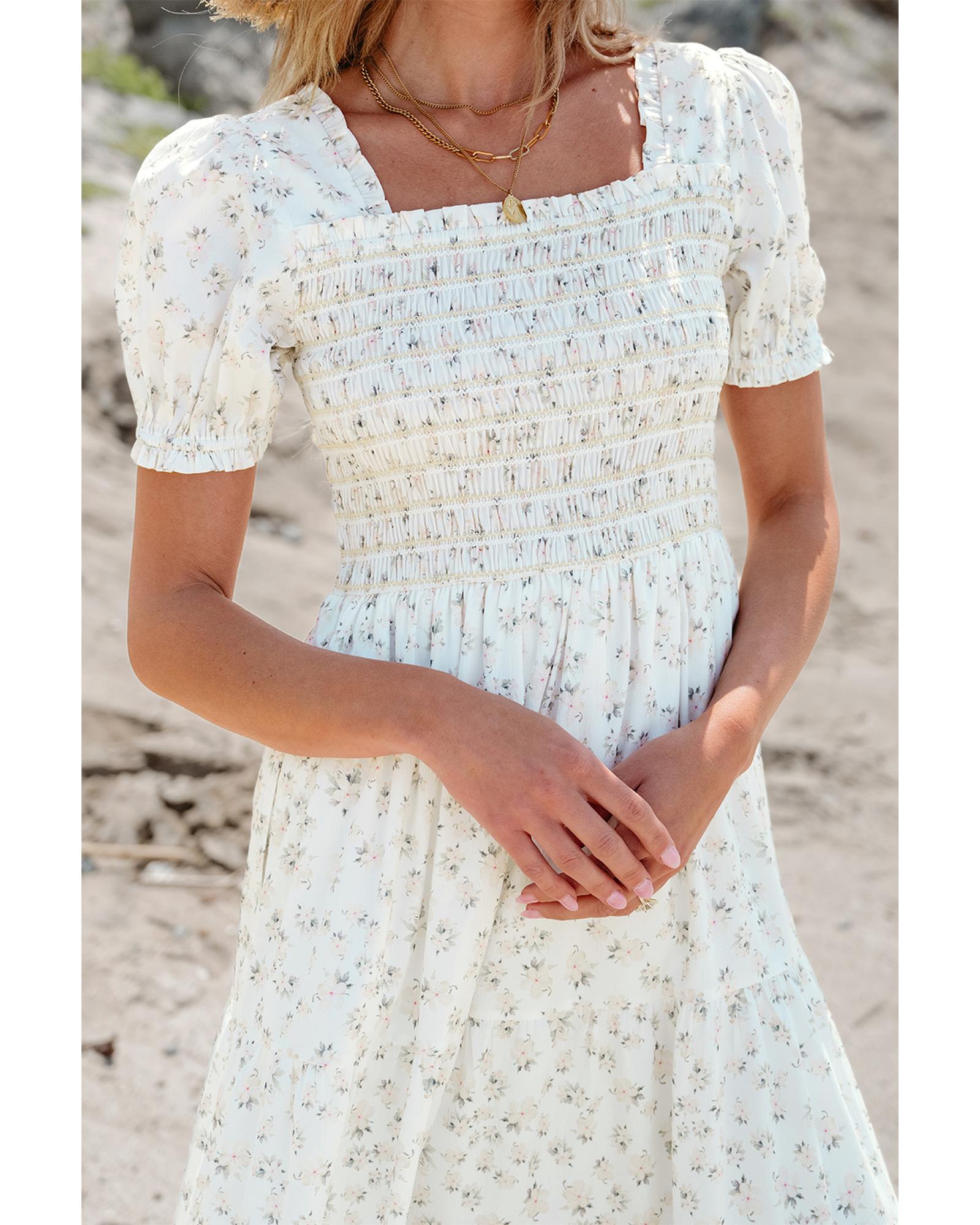 - White Frilly Shirred Bodice Tiered Floral Maxi Dress