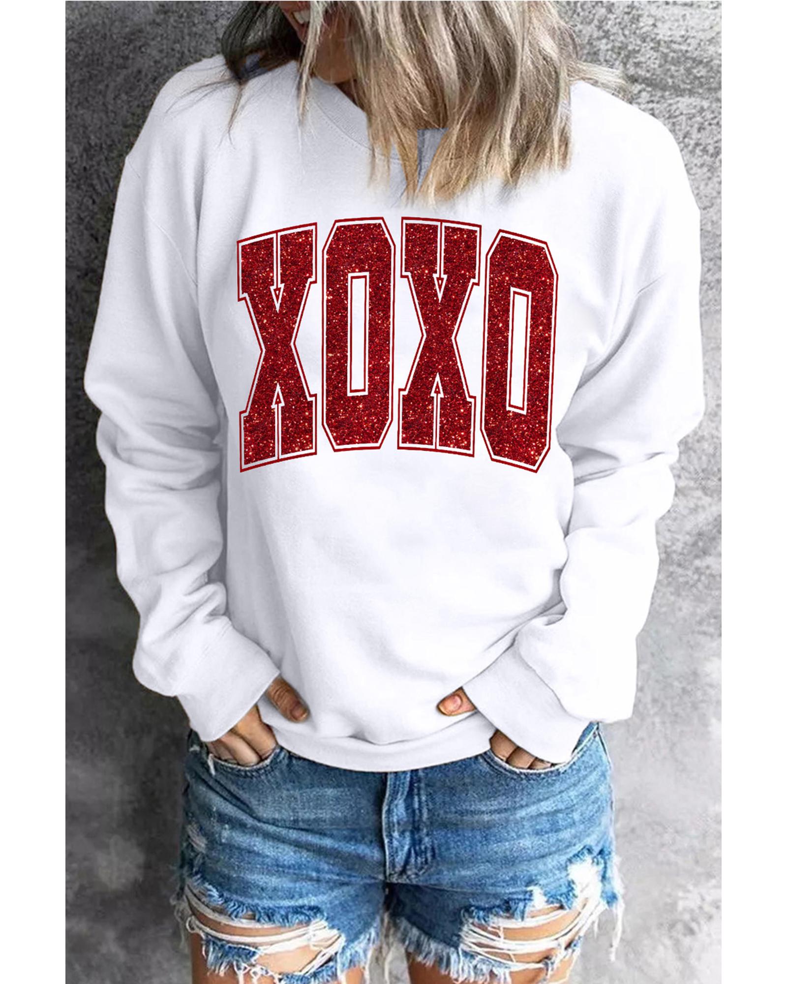 White Glitter XOXO Graphic Crewneck Valentines Pullover Sweatshirt – L