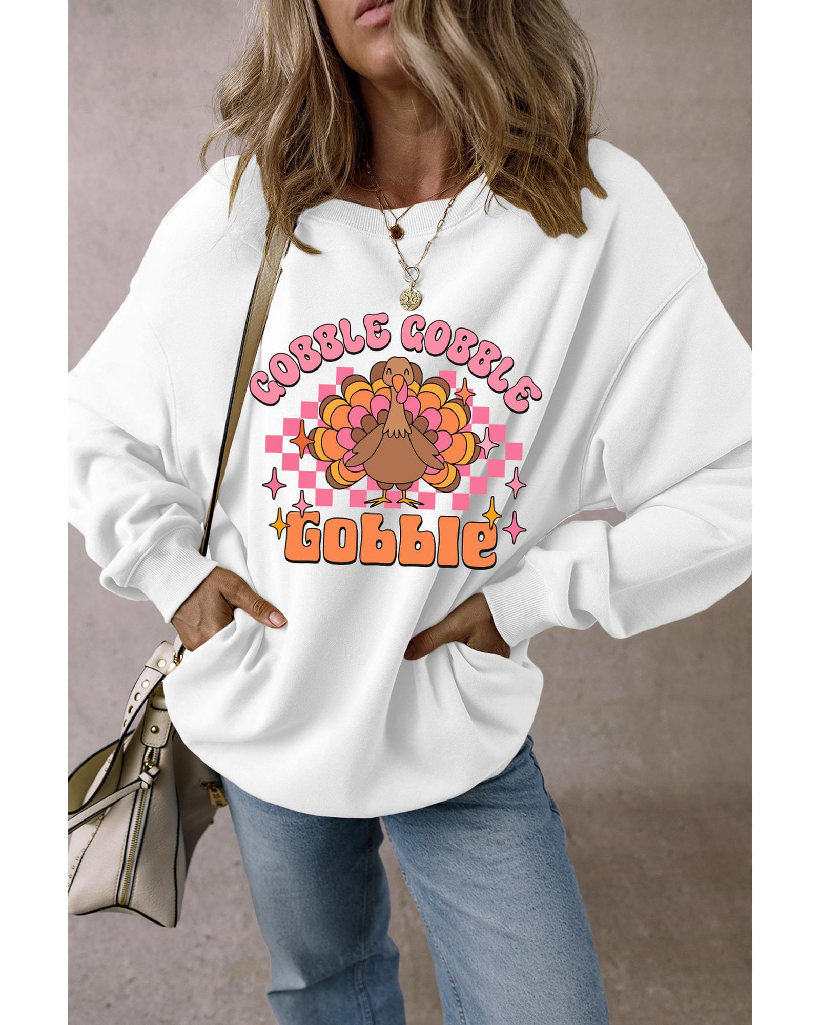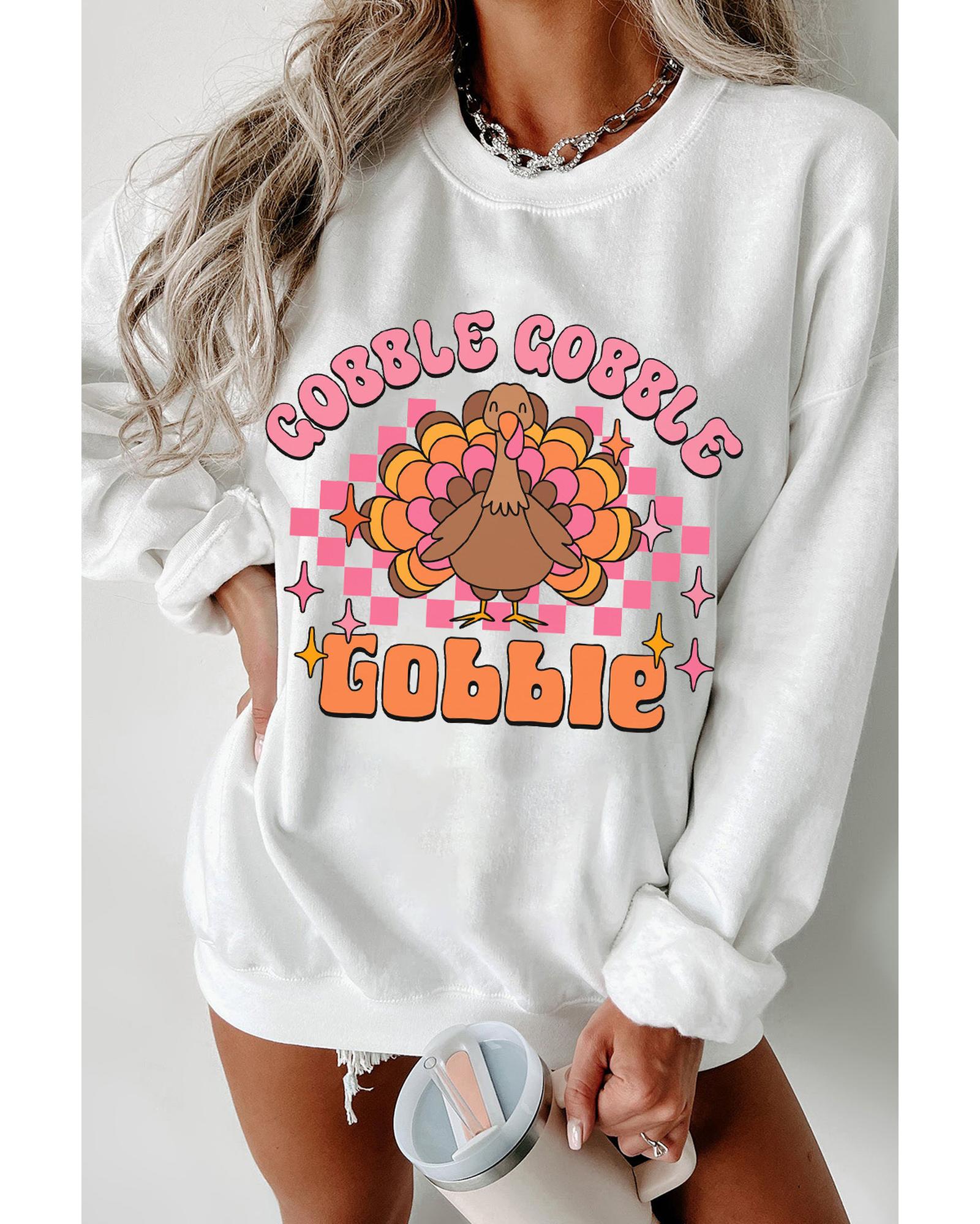 White Gobble Gobble Turkey Graphic Crewneck Thanksgiving Sweatshirt – L
