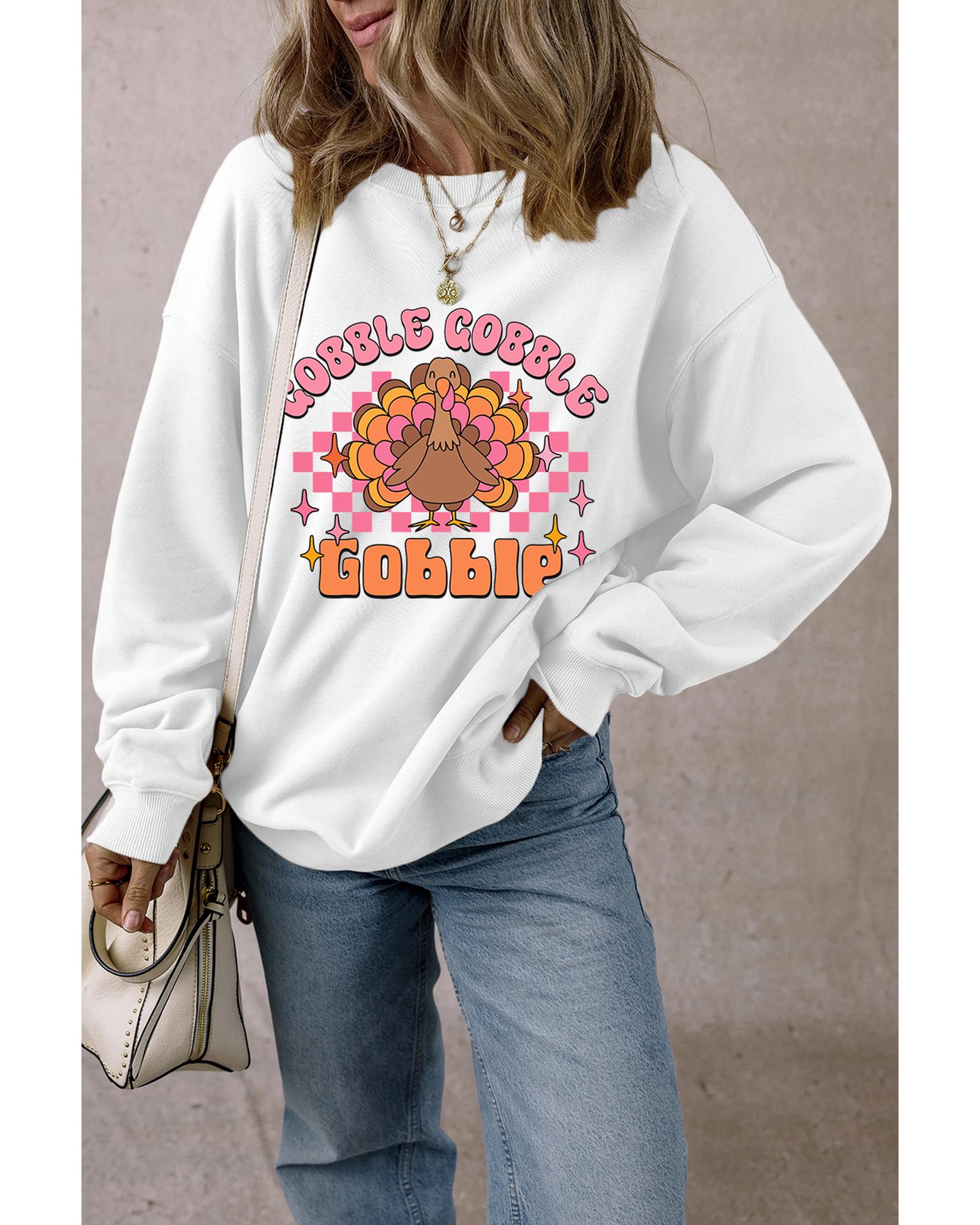 White Gobble Gobble Turkey Graphic Crewneck Thanksgiving Sweatshirt – S
