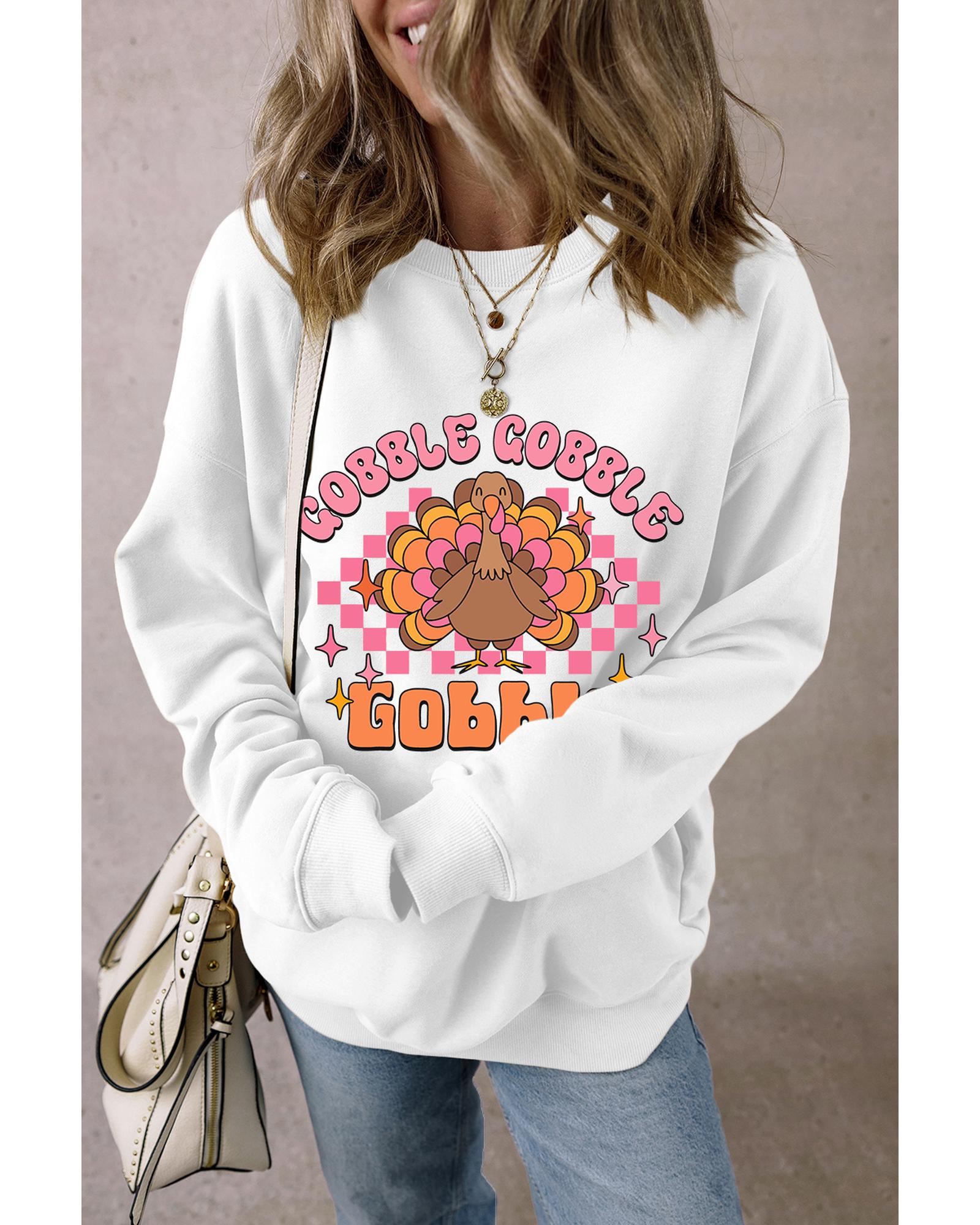 White Gobble Gobble Turkey Graphic Crewneck Thanksgiving Sweatshirt – XL