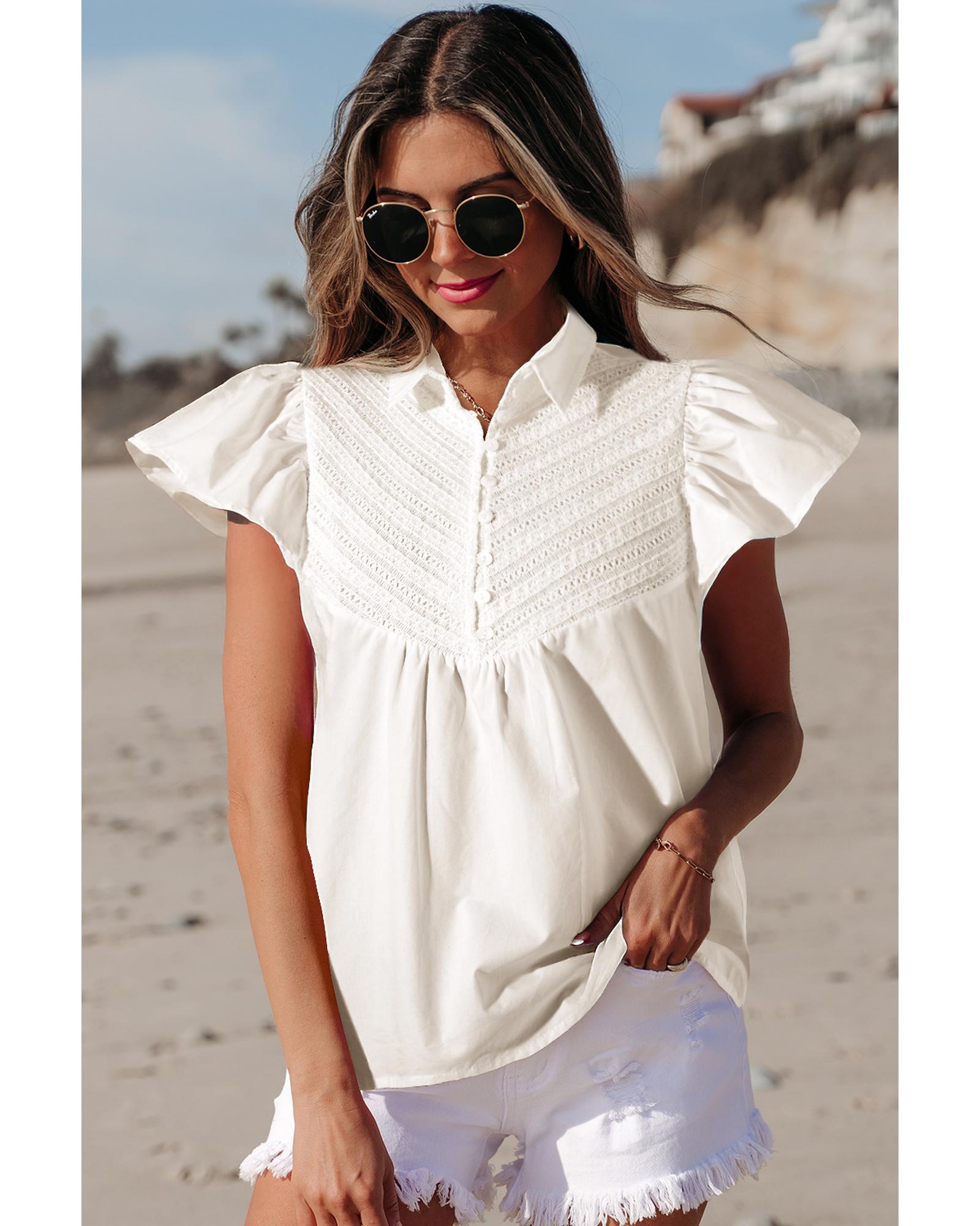 - White Half Button Lace Patchwork Flutter Sleeve Blouse
