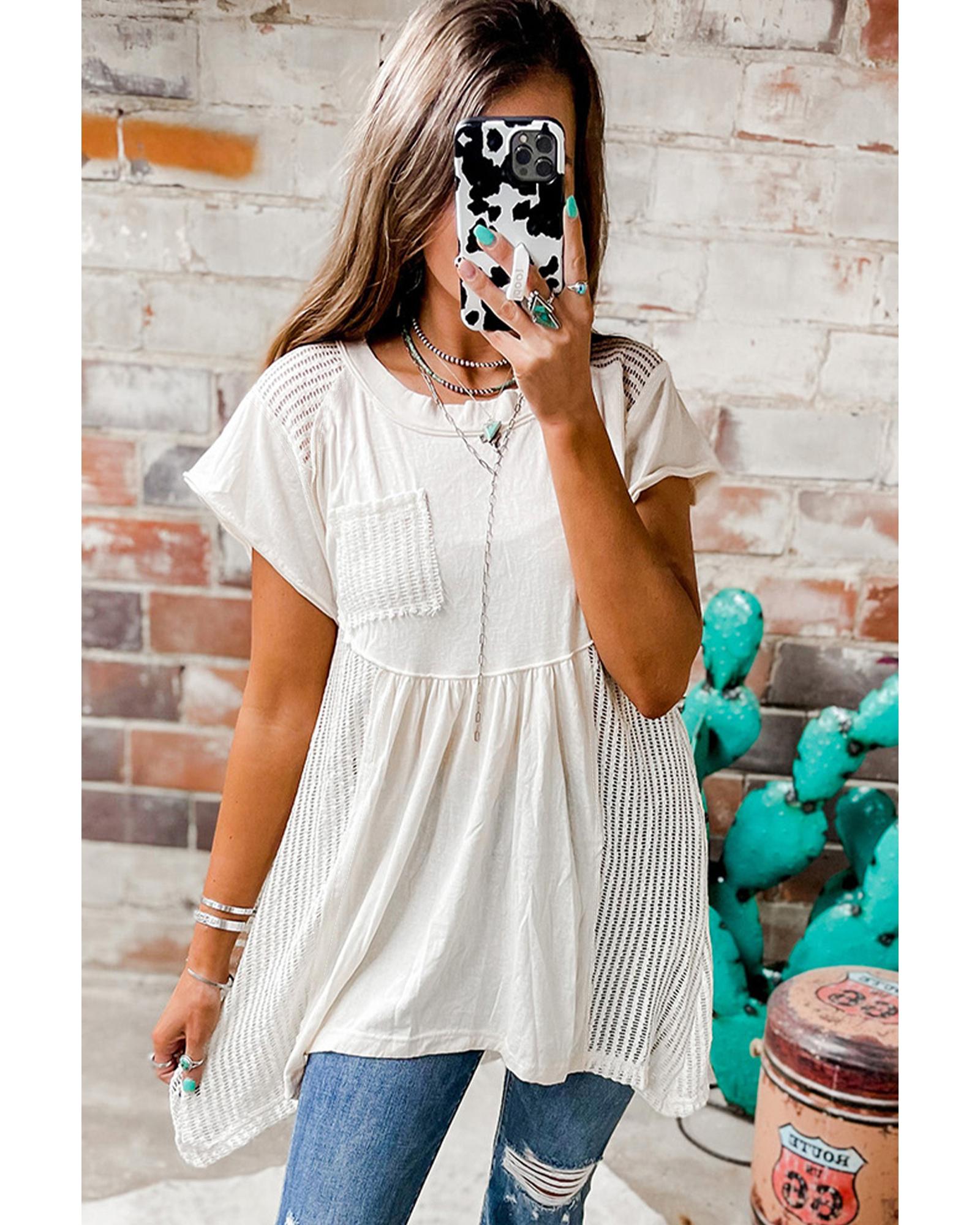 - White Hollow Knit Splicing Keyhole Back Tunic Top
