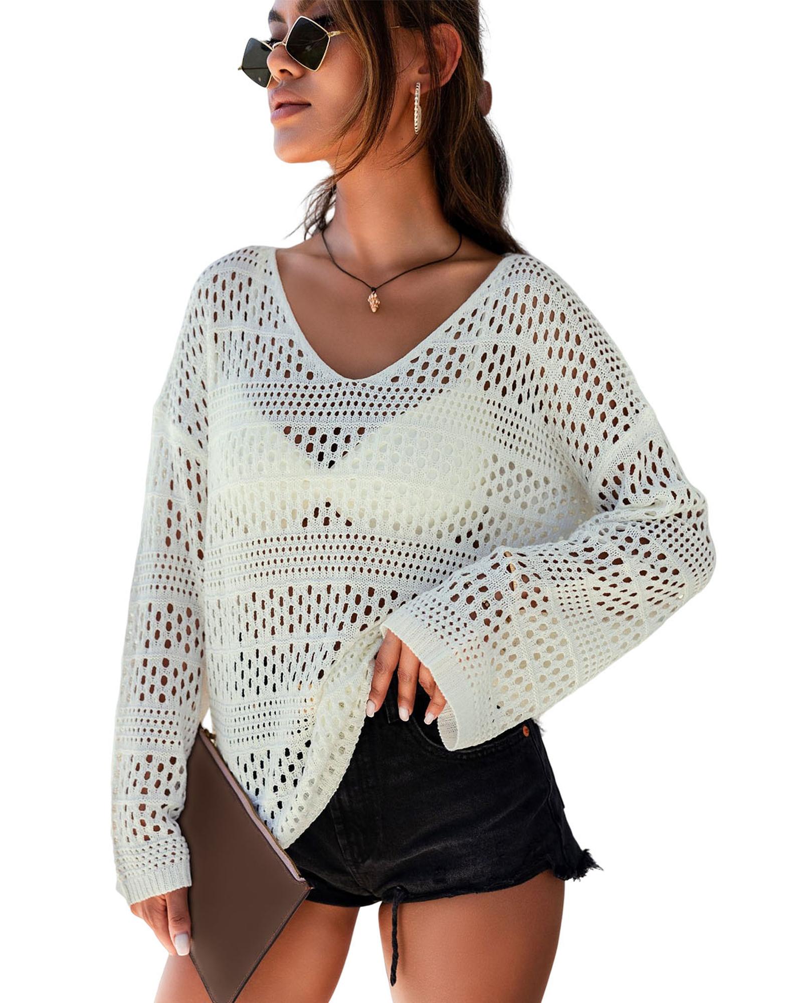 White Hollow Out Crochet V Neck Pullover Sweater – XL