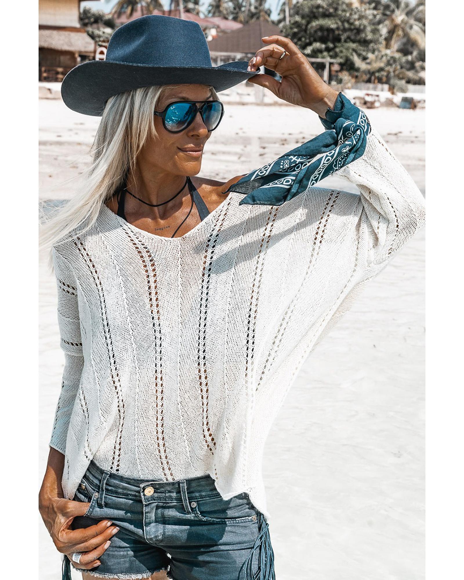 White Hollowed Detail Knitted Loose V Neck Sweater – L