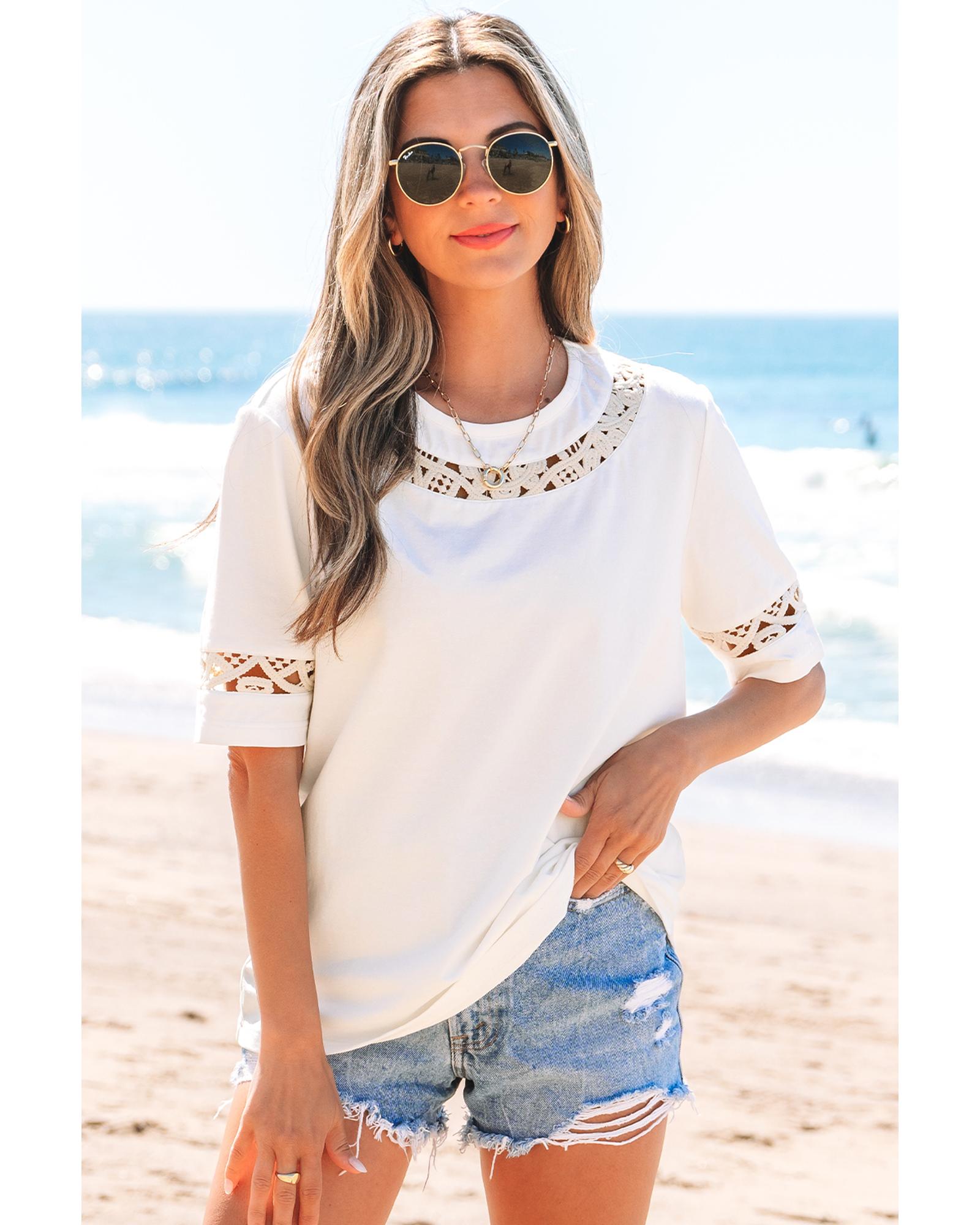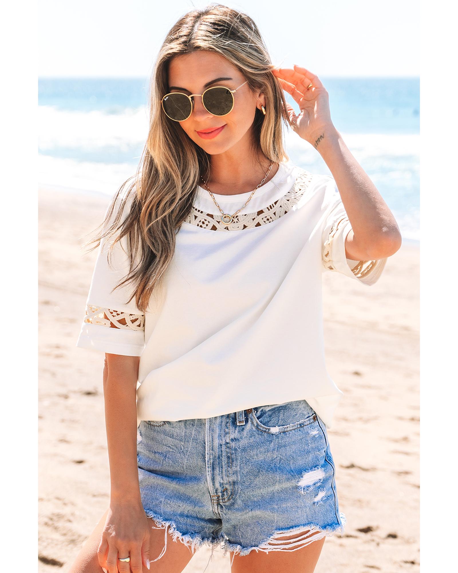 White Lace Crochet Crew Neck Casual T Shirt – S