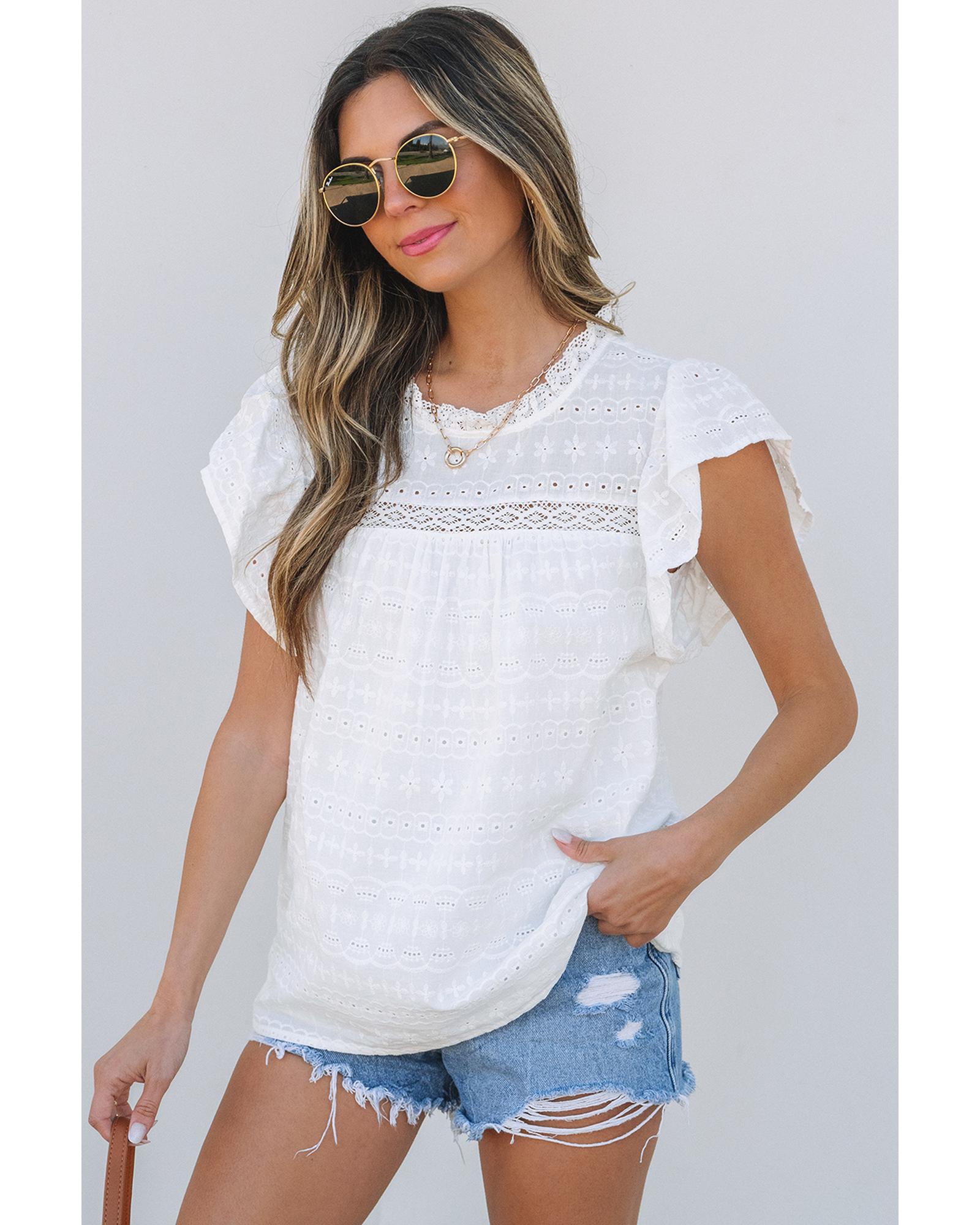 White Lace Neckline Flutter Sleeve Eyelets Blouse – S