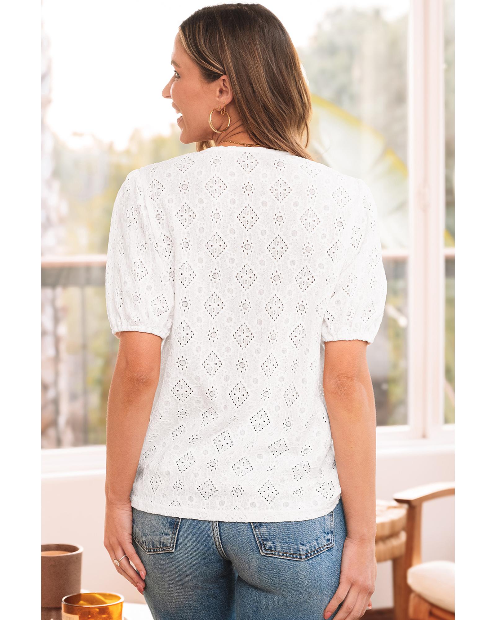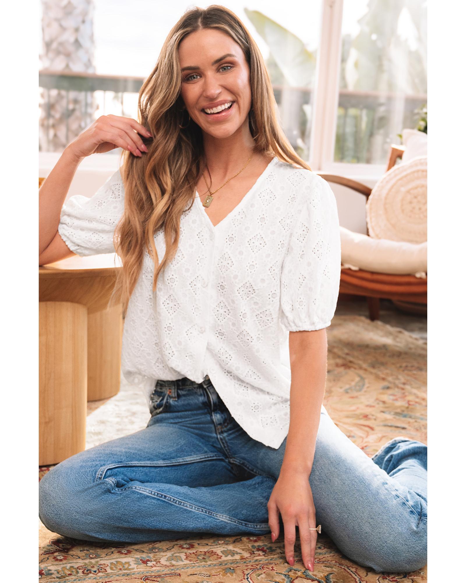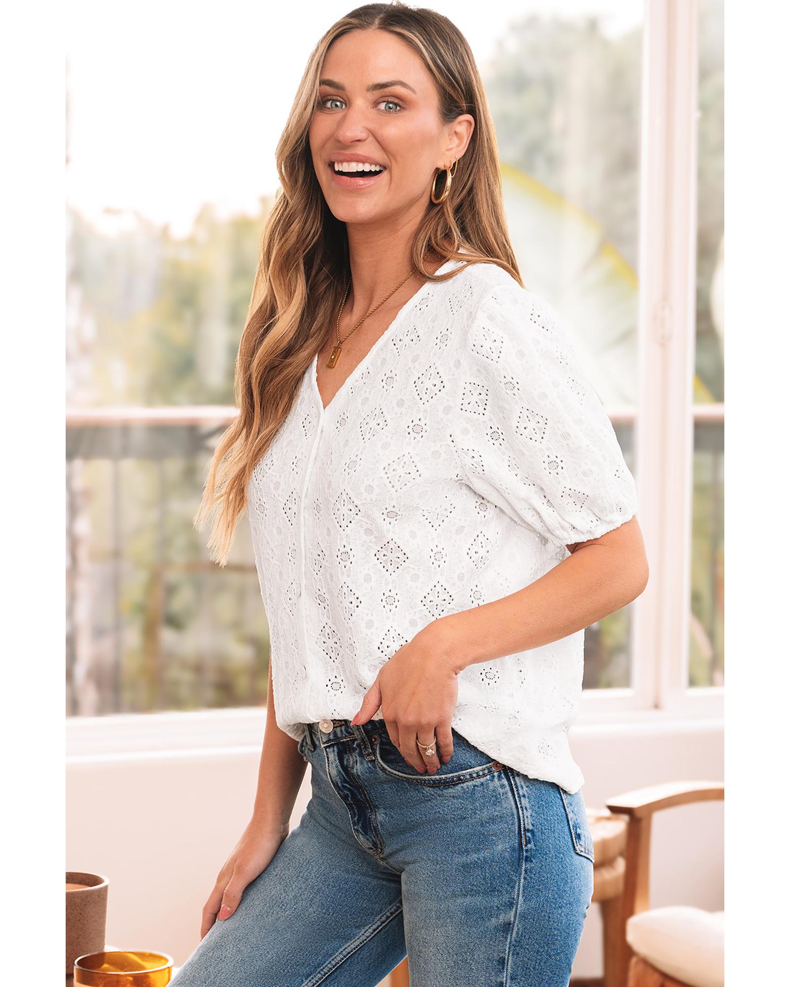 White Lace Puff Sleeve V Neck Button Up Shirt – XL