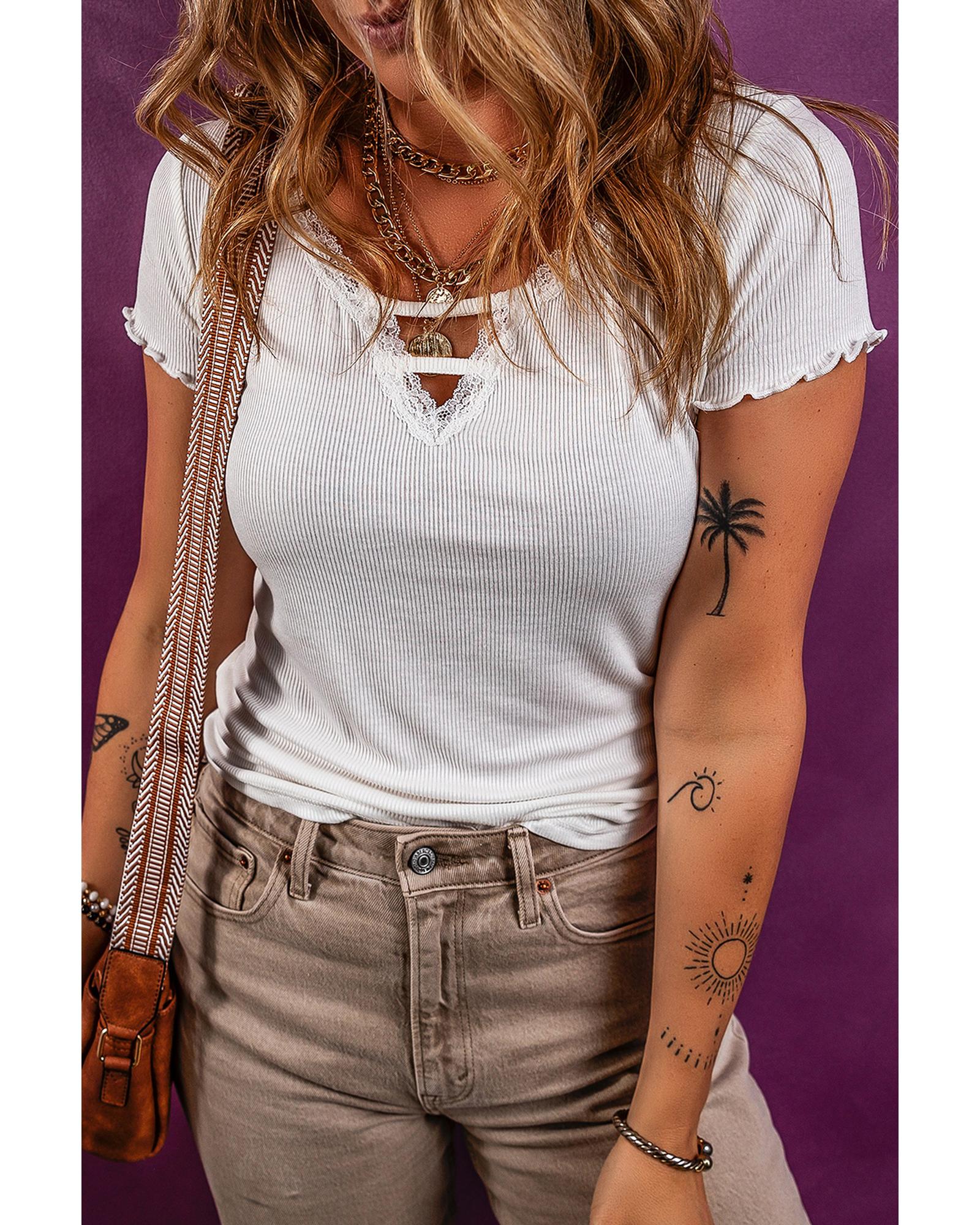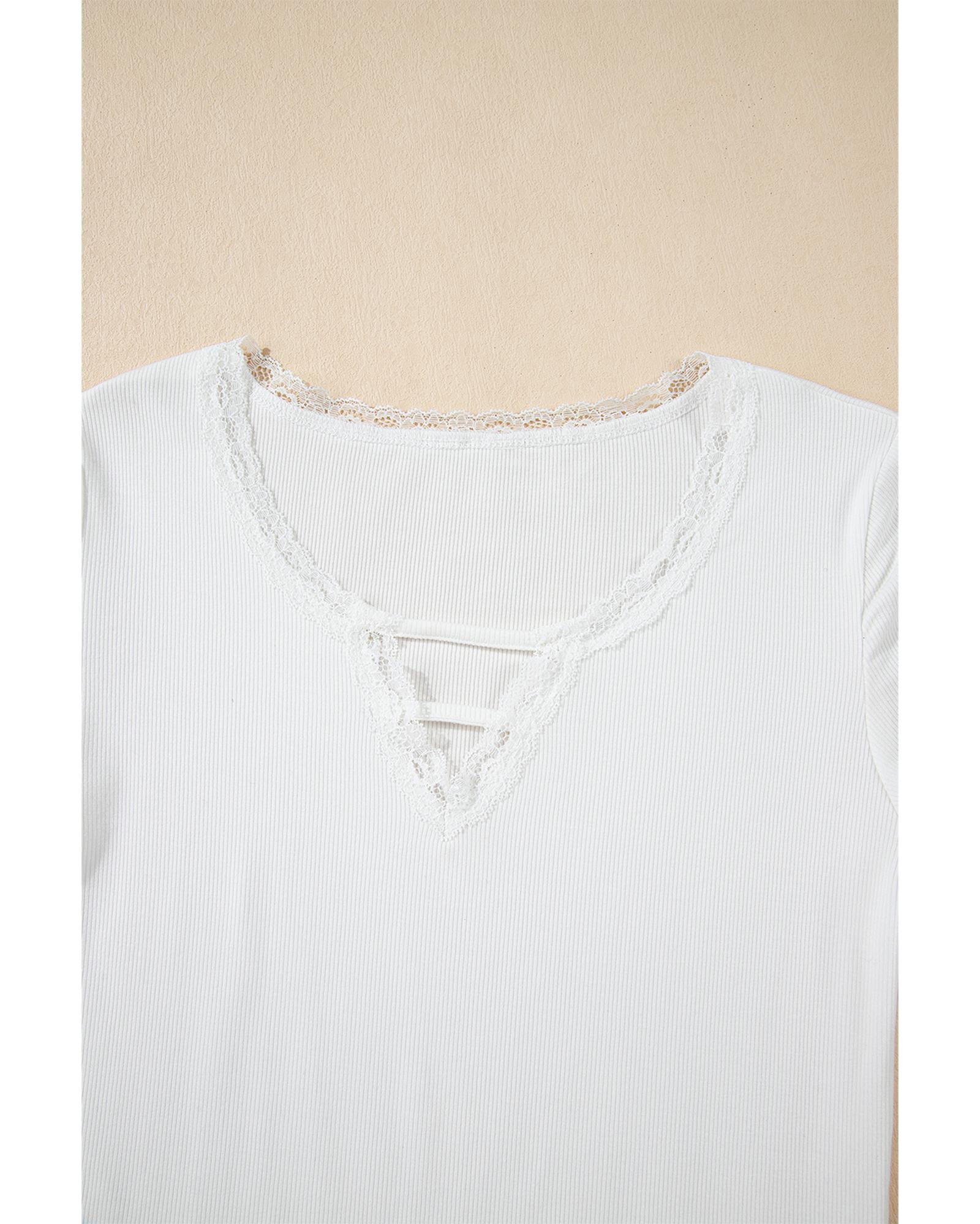 - White Lace V Neckline Ribbed Slim Fit T Shirt