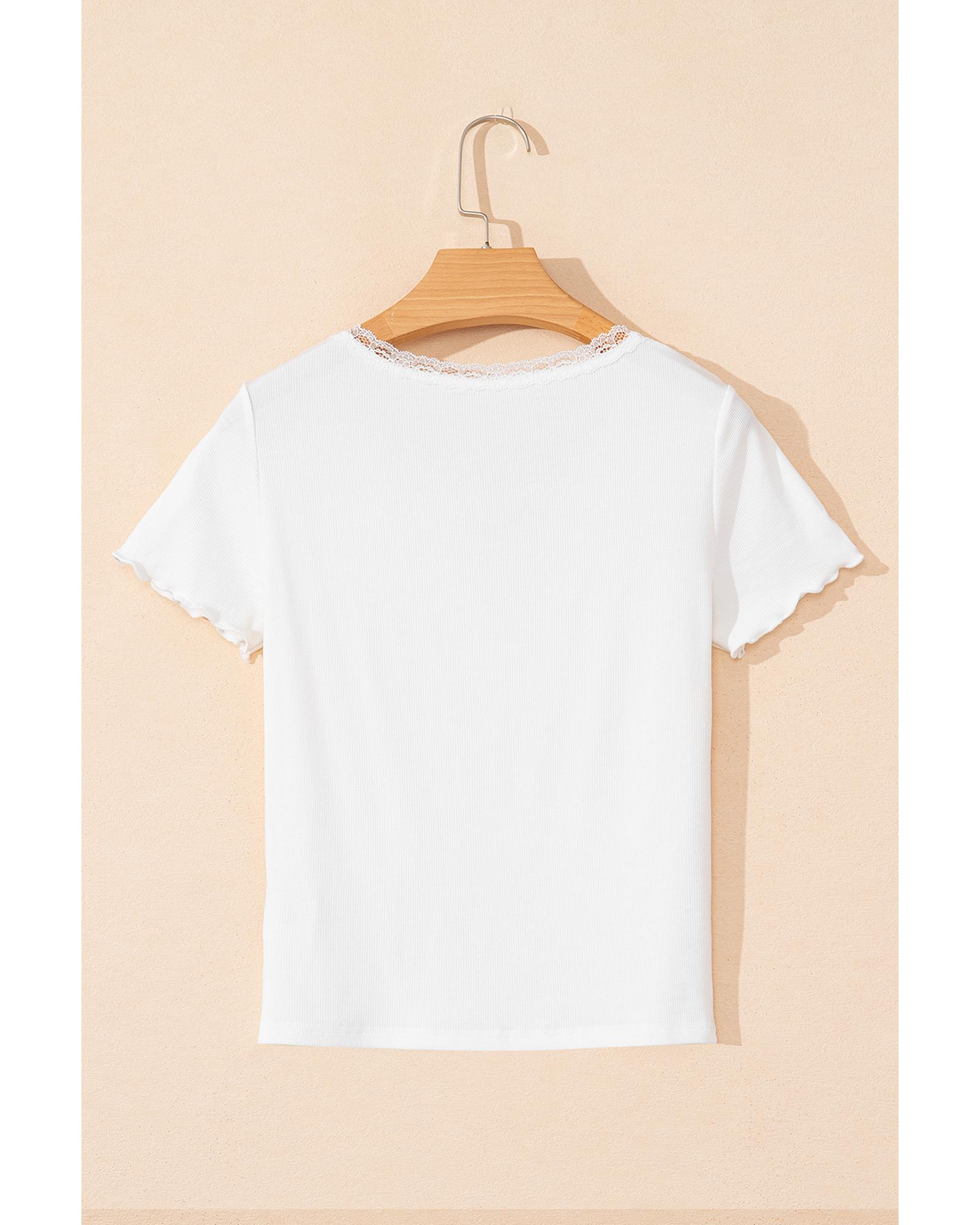 - White Lace V Neckline Ribbed Slim Fit T Shirt