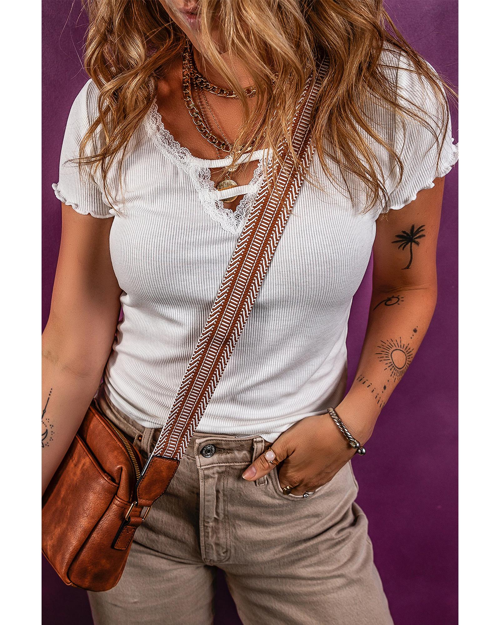 - White Lace V Neckline Ribbed Slim Fit T Shirt