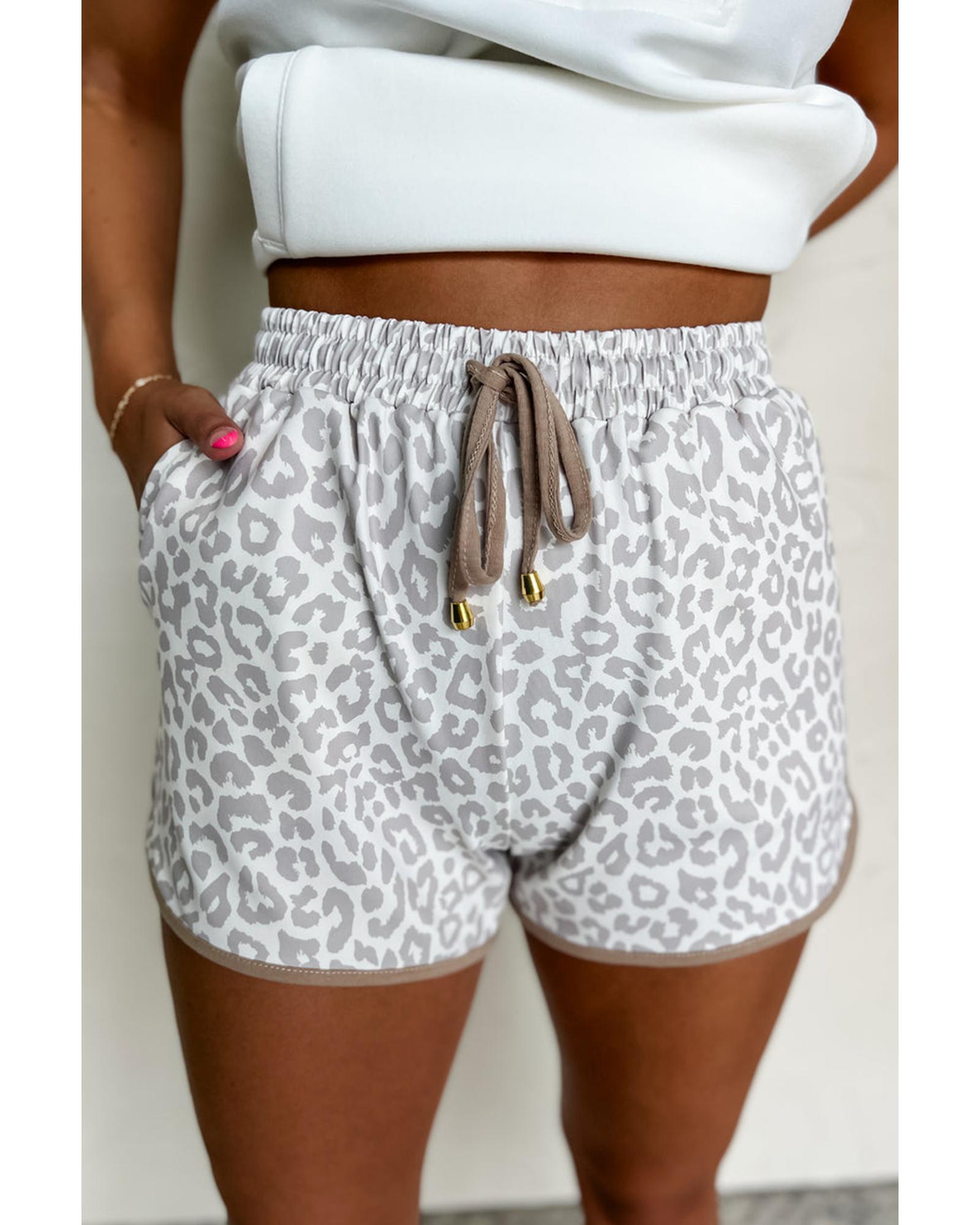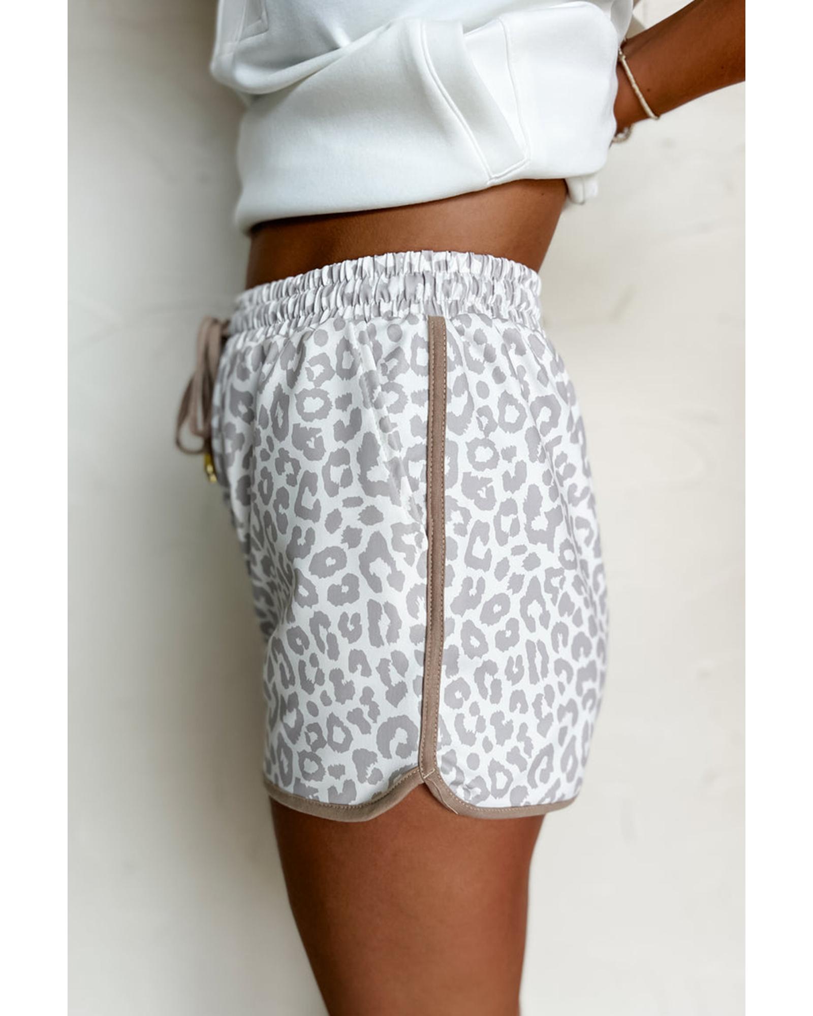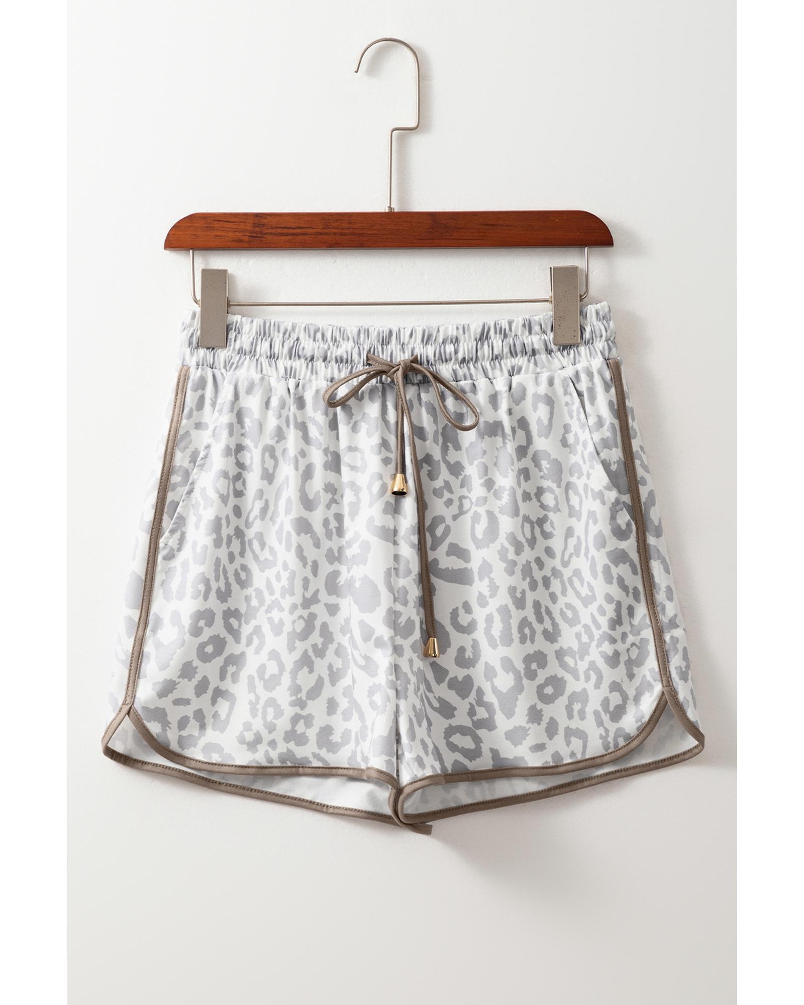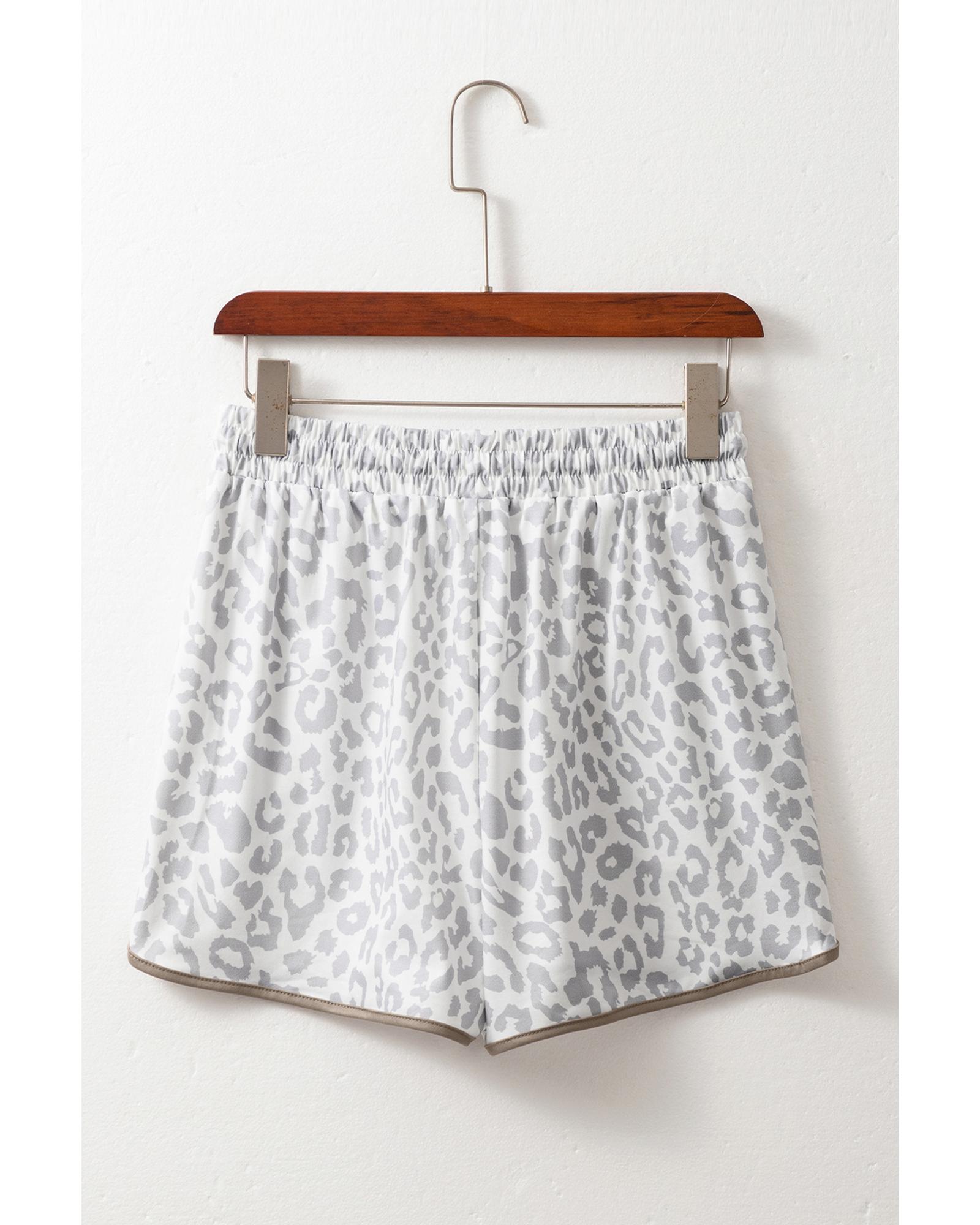 White Leopard Elastic Waist Lace up Contrast Trim Casual Shorts – L