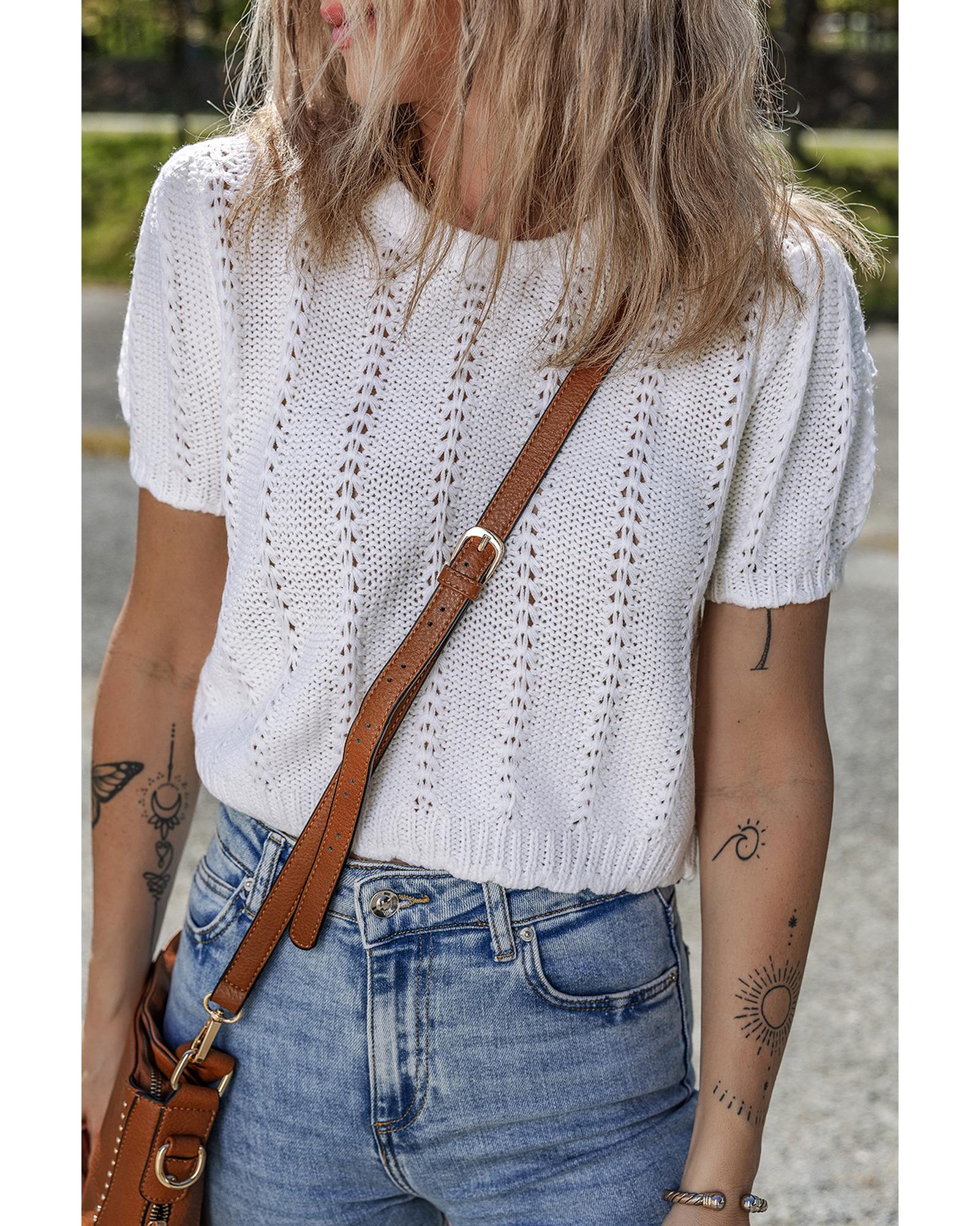 White Pointelle Knit Short Puff Sleeve Crewneck Sweater – M