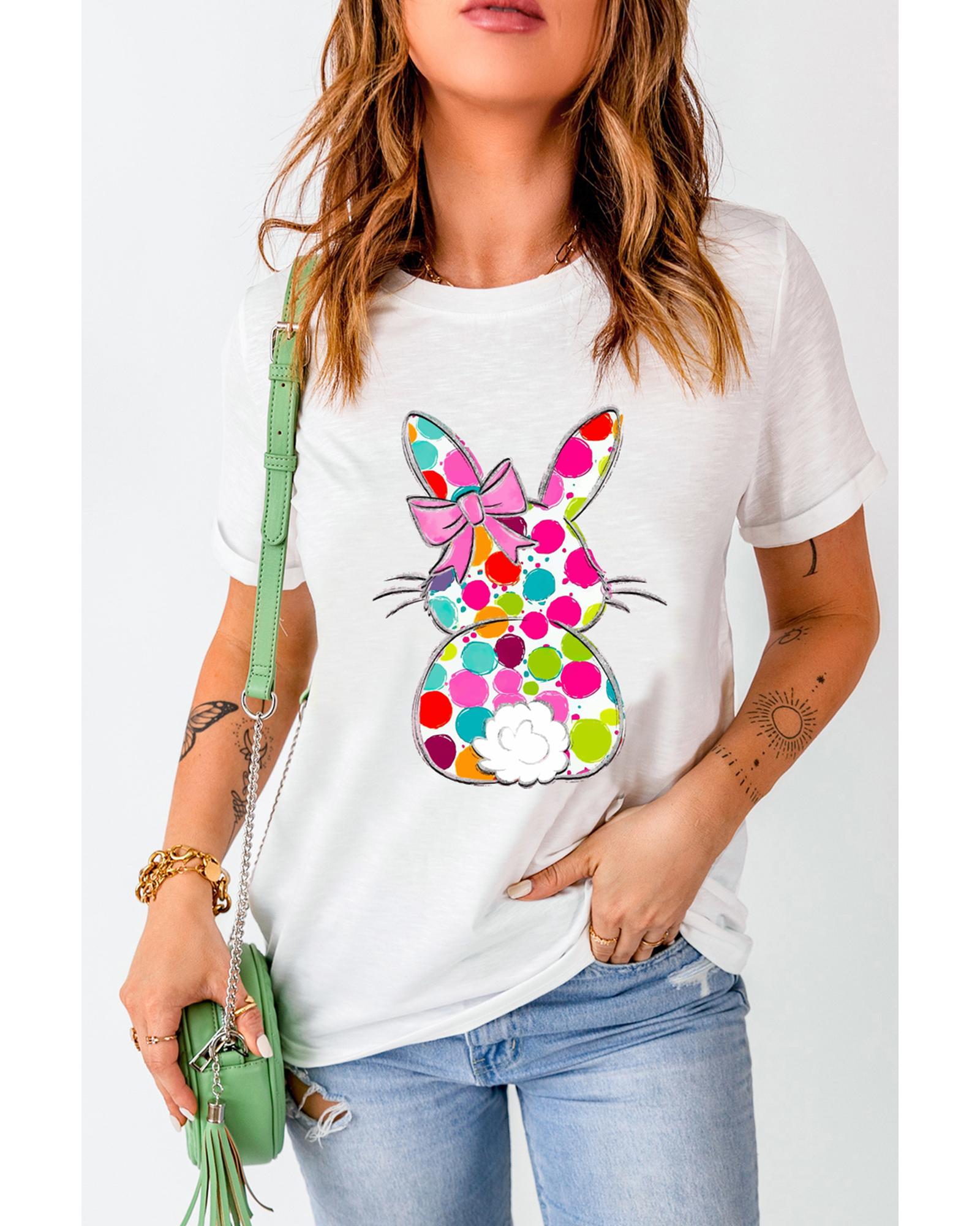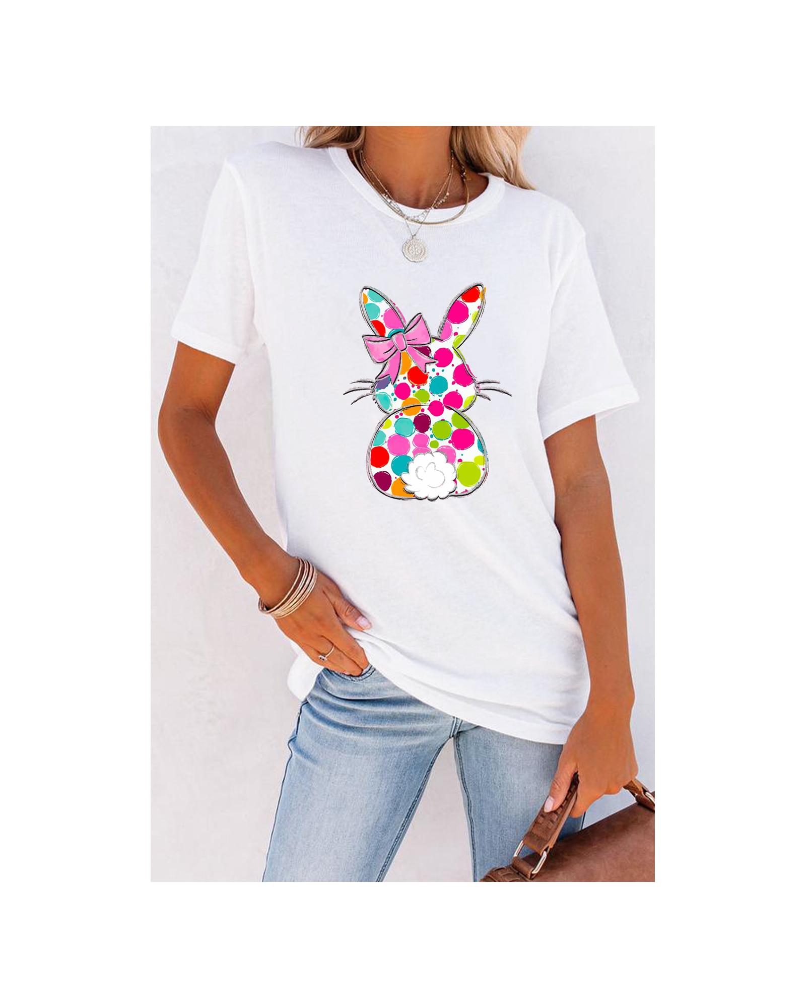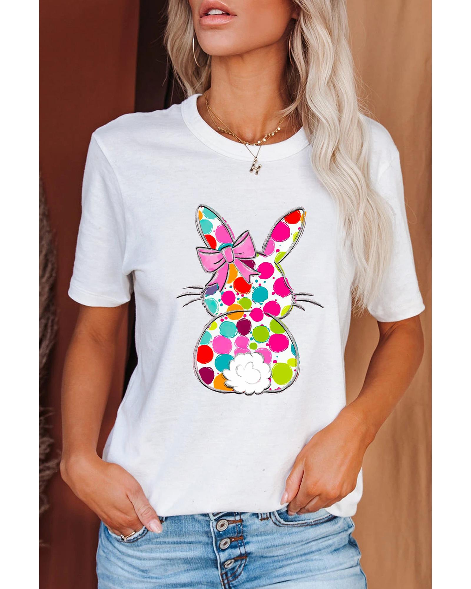 White Polka Dot Bow Rabbit Graphic Crewneck Easter Fashion Tee – M