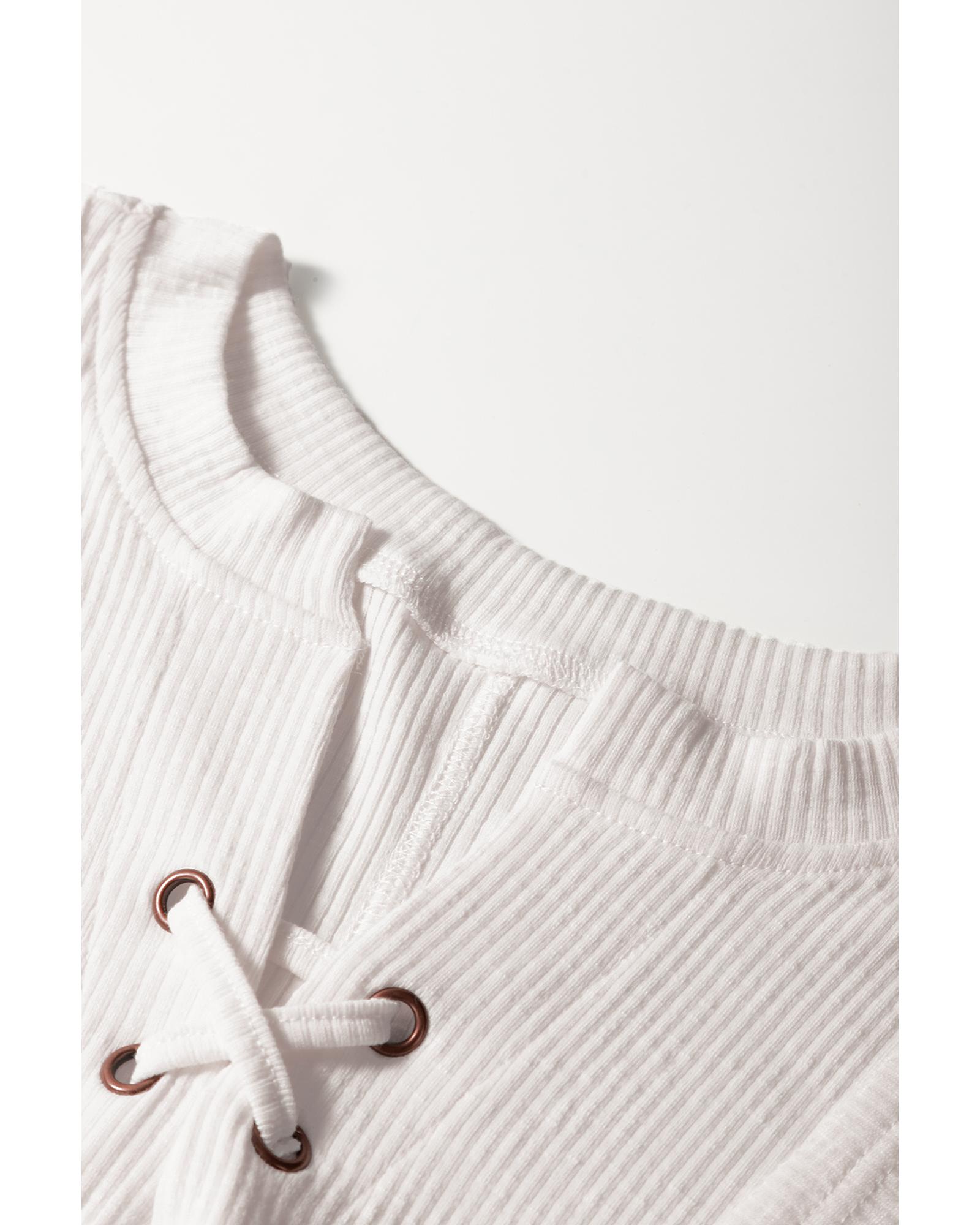 White Ribbed Texture Lace Patchwork Short Sleeve Top – XL