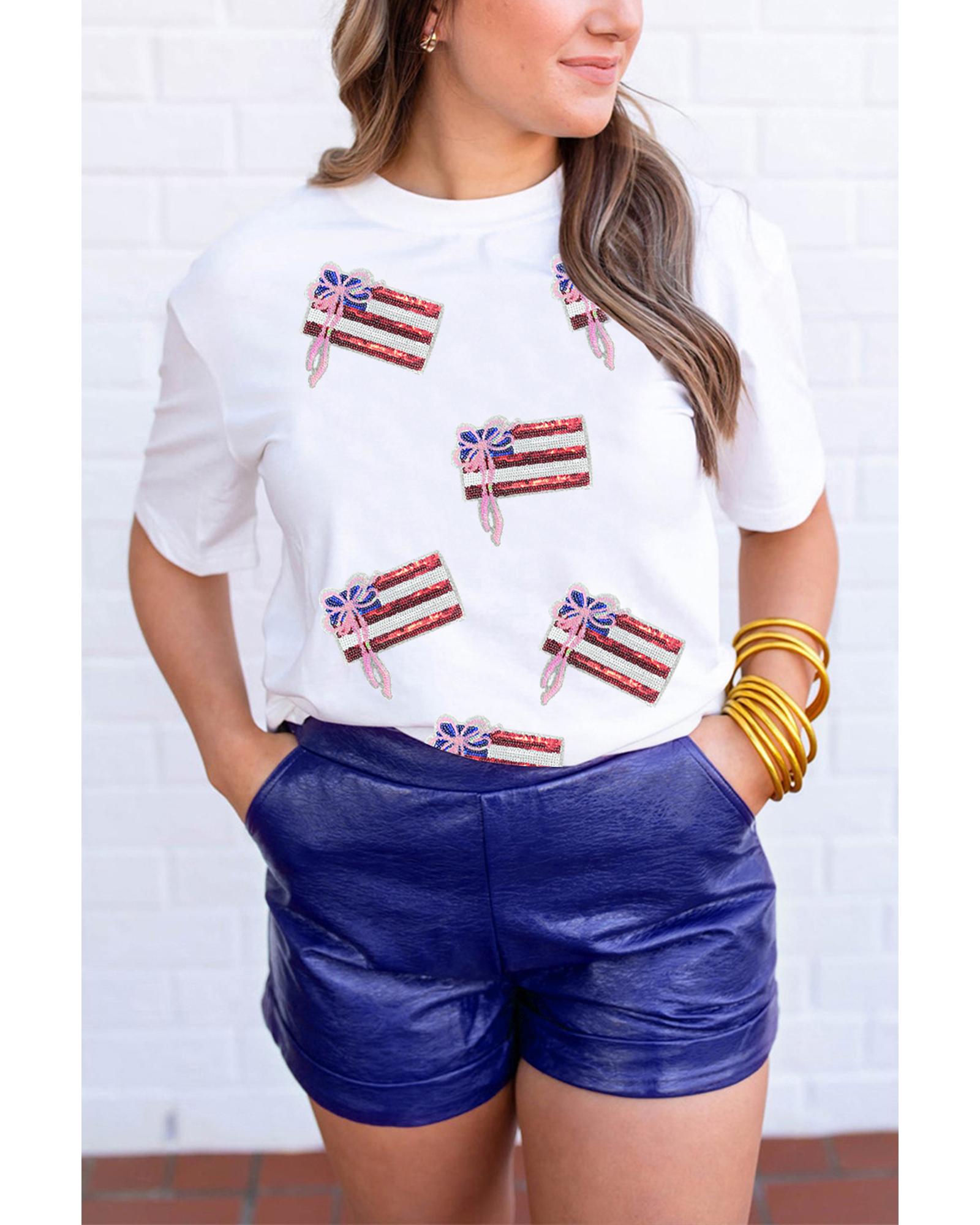 White Sequin Bow American Flag Patched T Shirt – XL