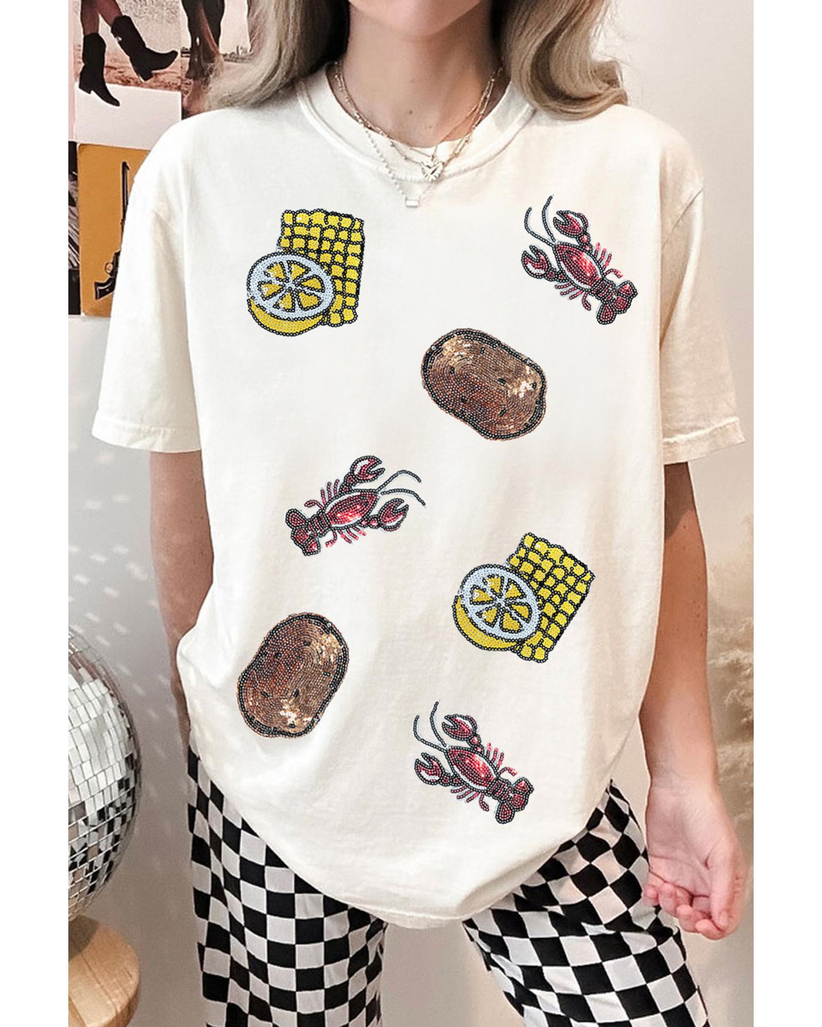 White Sequin Crawfish Potato Lemon Corn Graphic Crewneck T Shirt – M