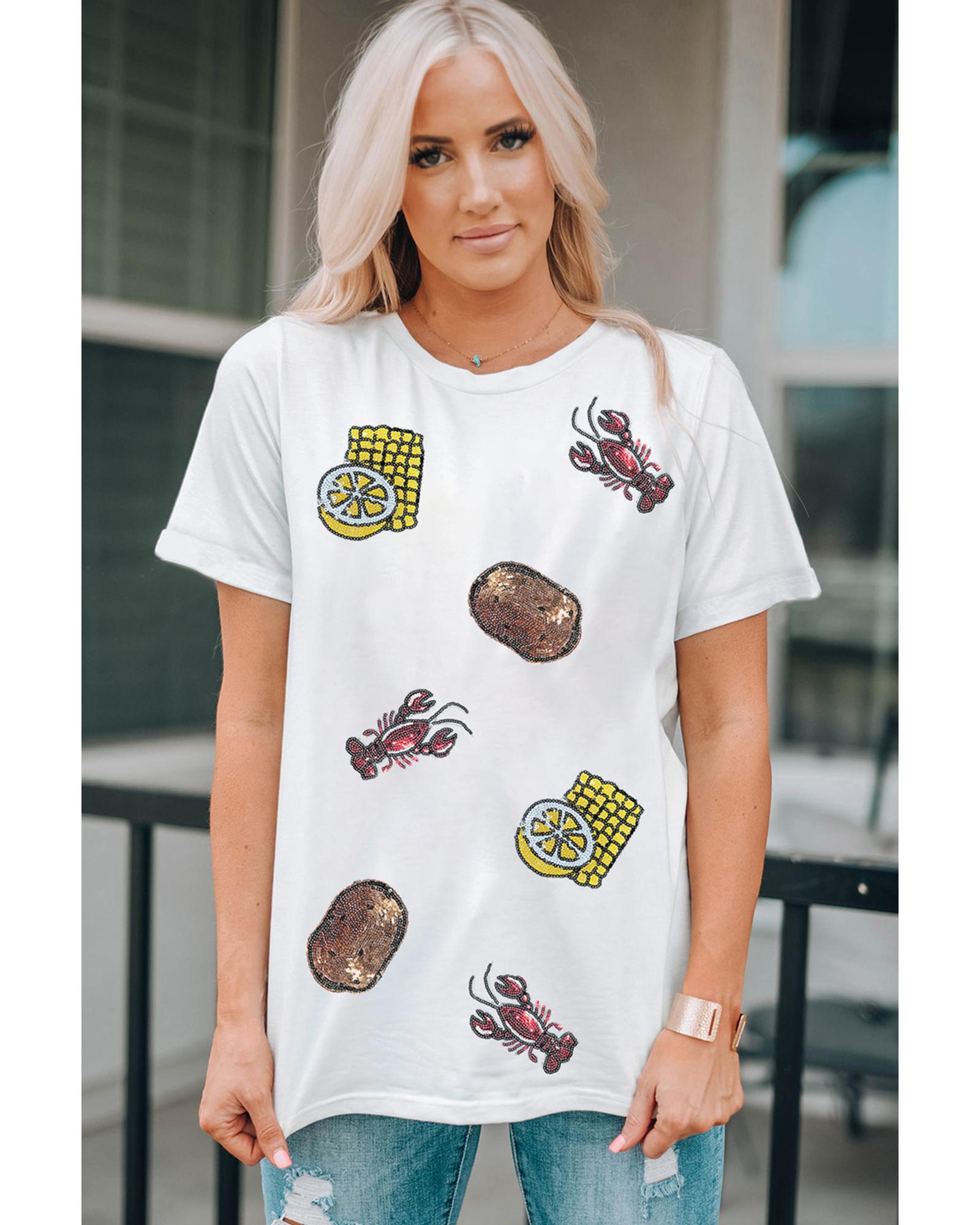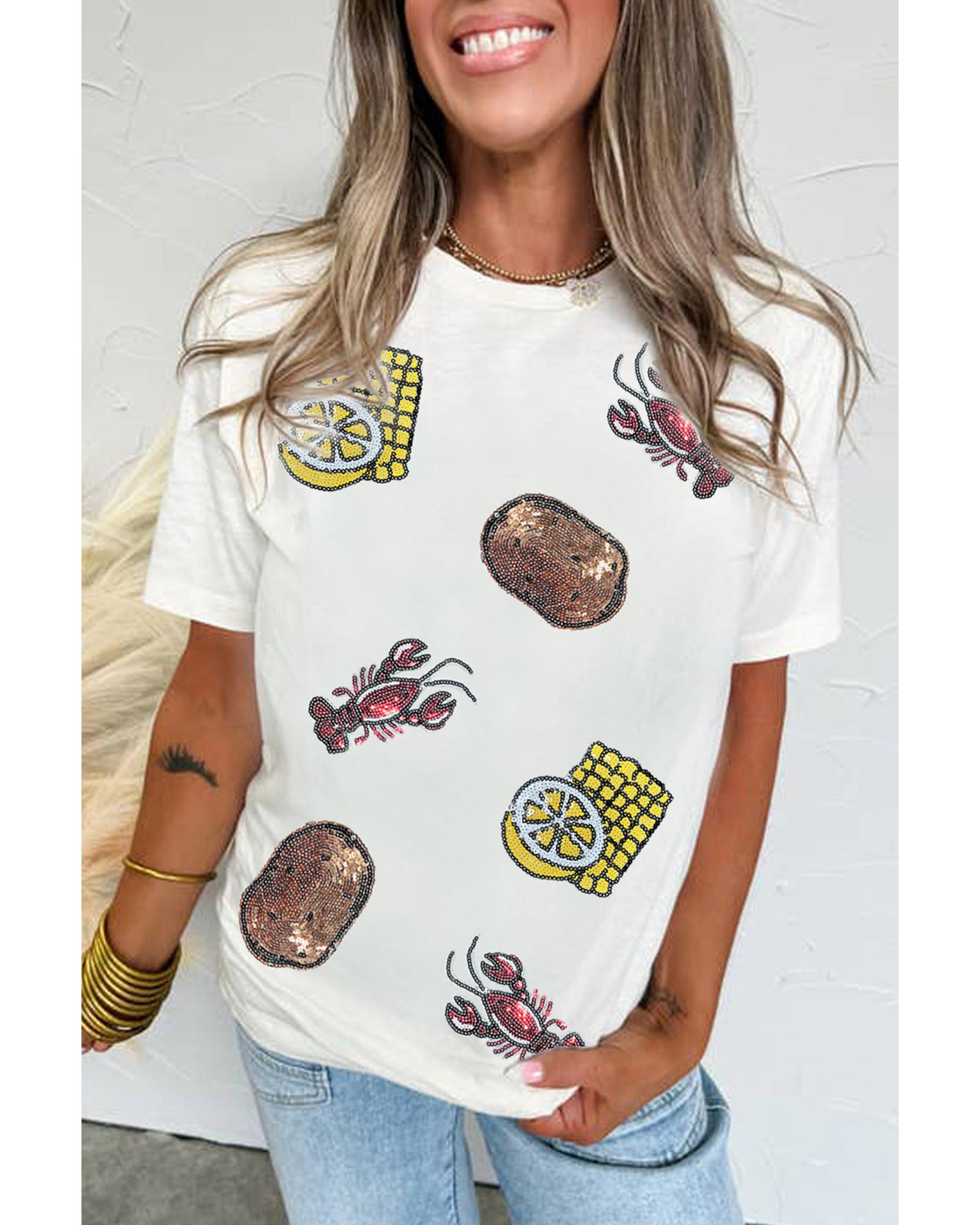 White Sequin Crawfish Potato Lemon Corn Graphic Crewneck T Shirt – XL