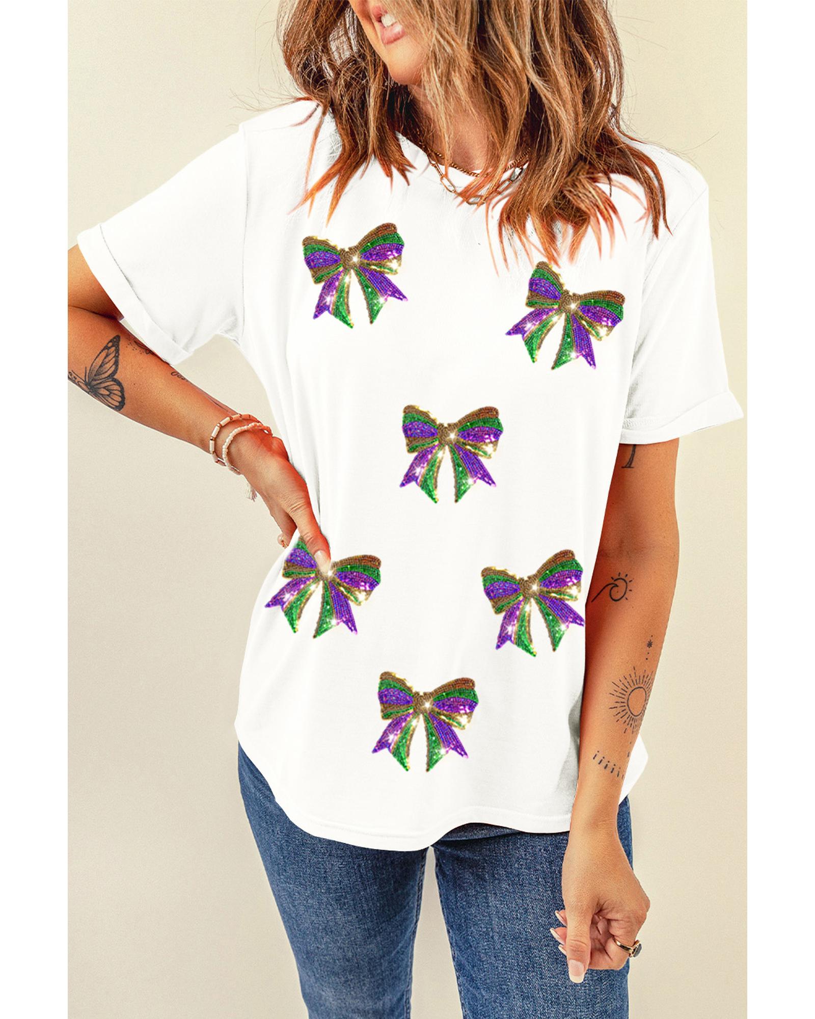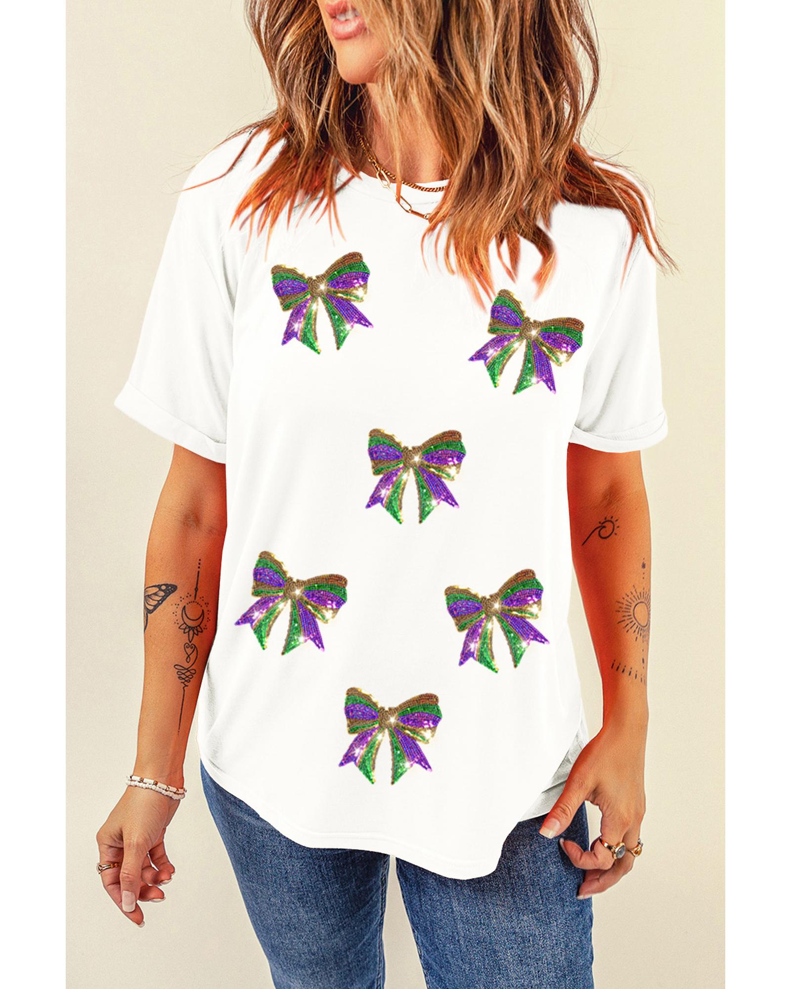 White Sequin Mardi Gras Bow Graphic Crewneck Tee – M