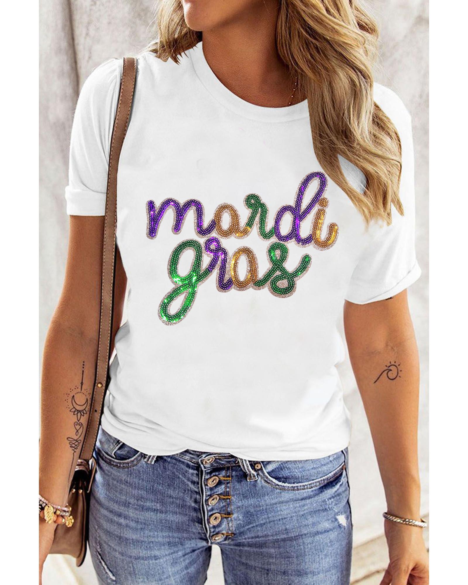 - White Sequin Mardi Gras Graphic T