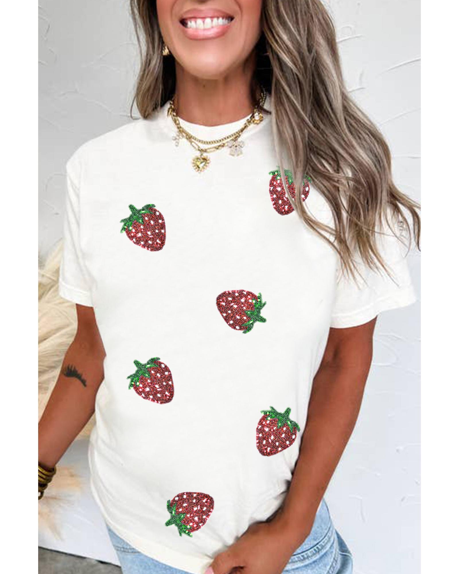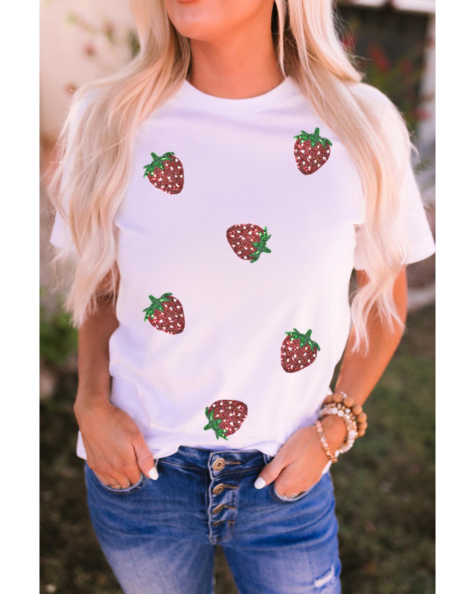 White Sequin Strawberry Patched Crew Neck T Shirt – XL