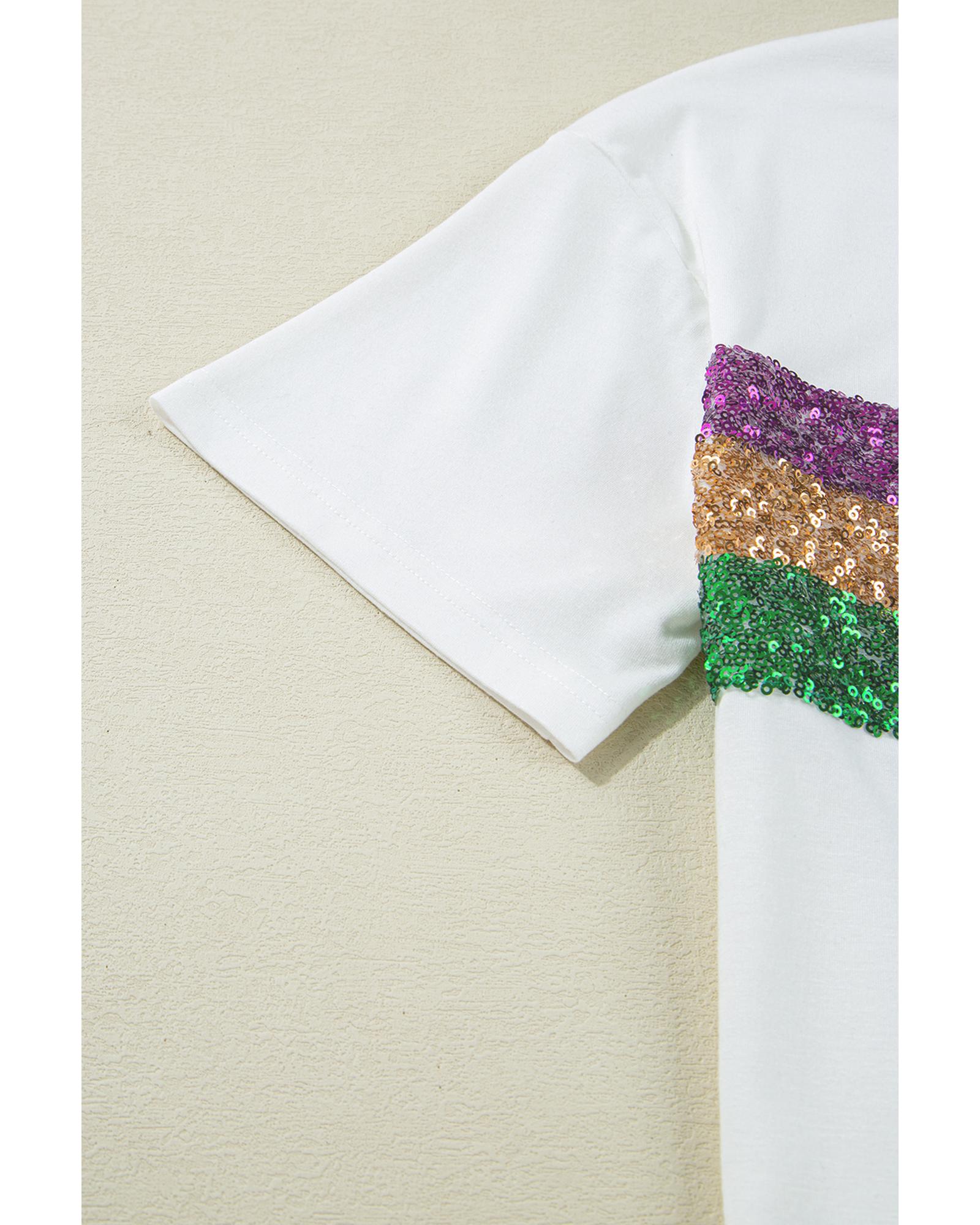 White Sequin Stripes Patchwork Mardi Gras Crew Neck T Shirt – L