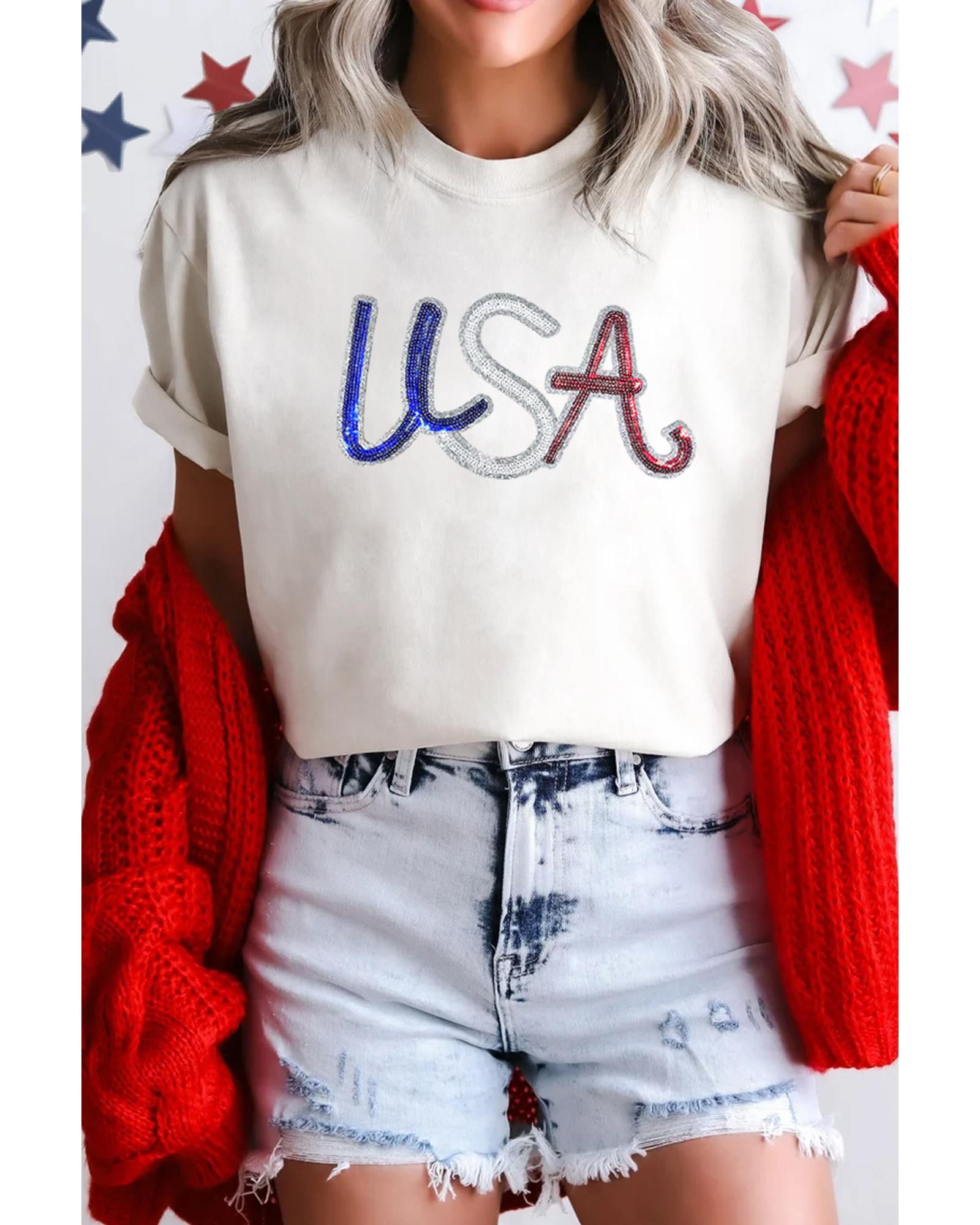 White Sequin USA Graphic Crew Neck Patriotic Tee – XL