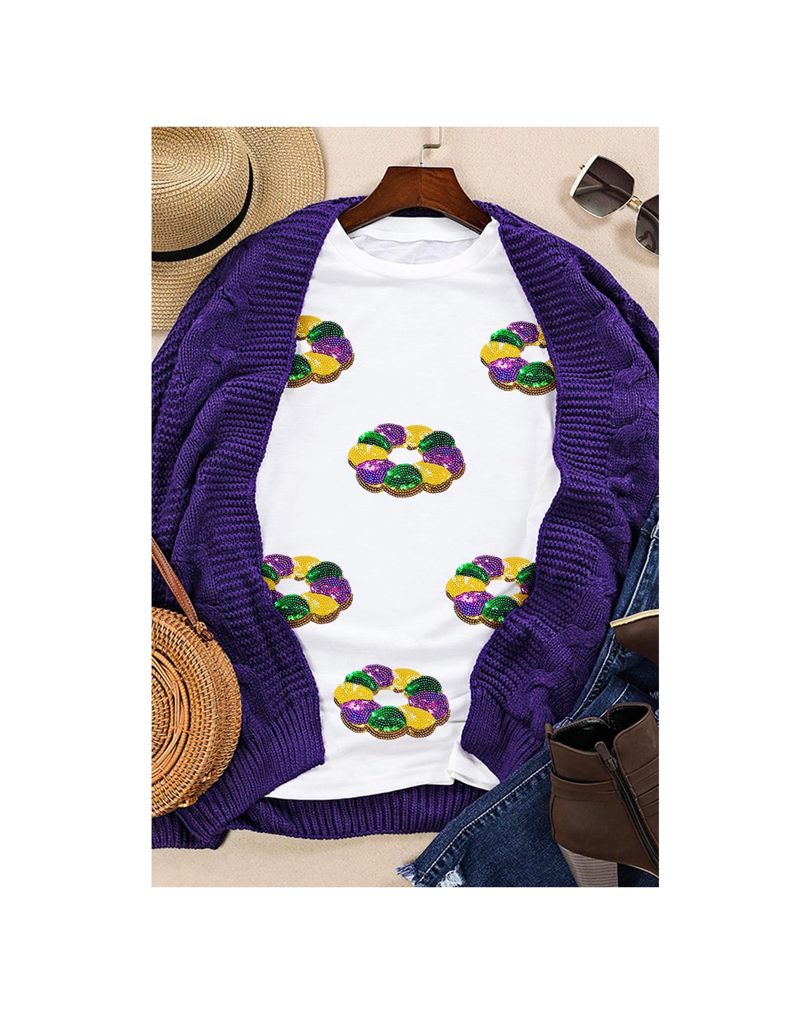 White Sequined Mardi Gras Pattern Crew Neck Short Sleeve Top – S