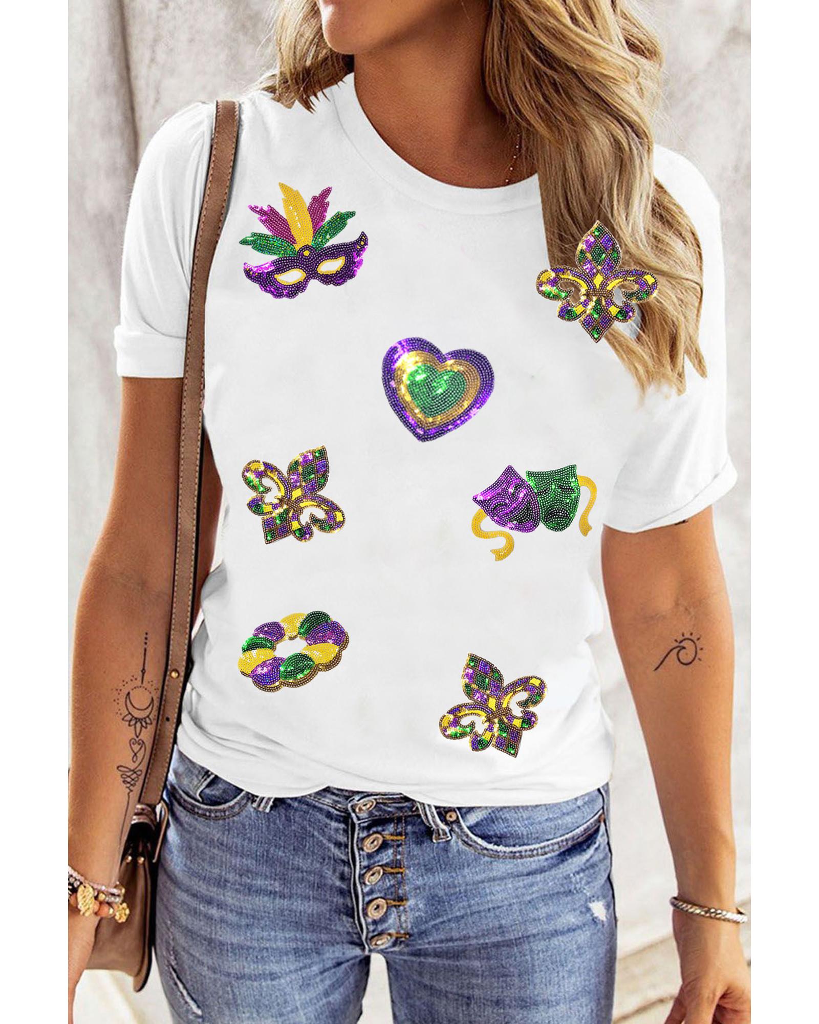 - White Sequined Mardi Gras Symbolic Pattern Casual Tee