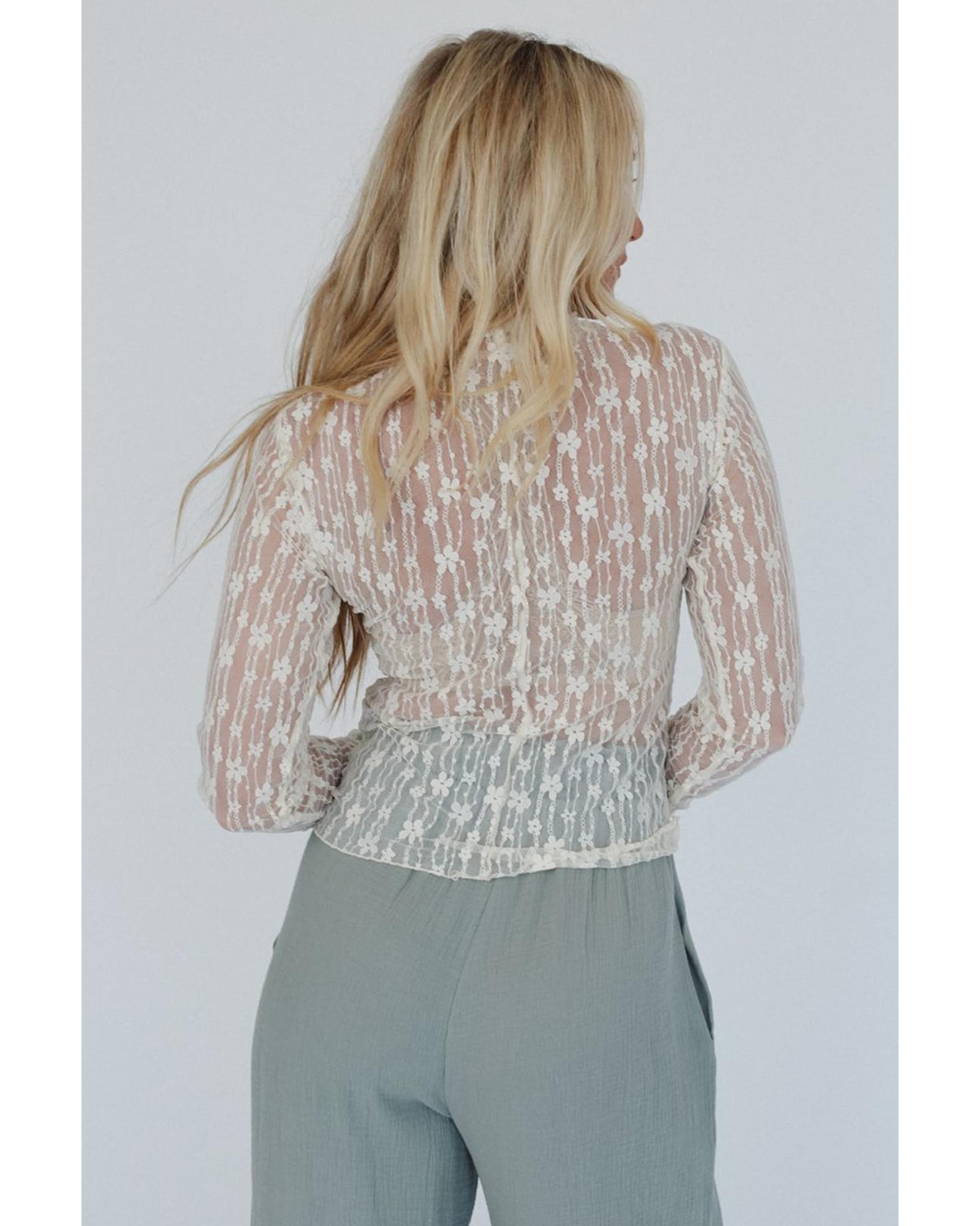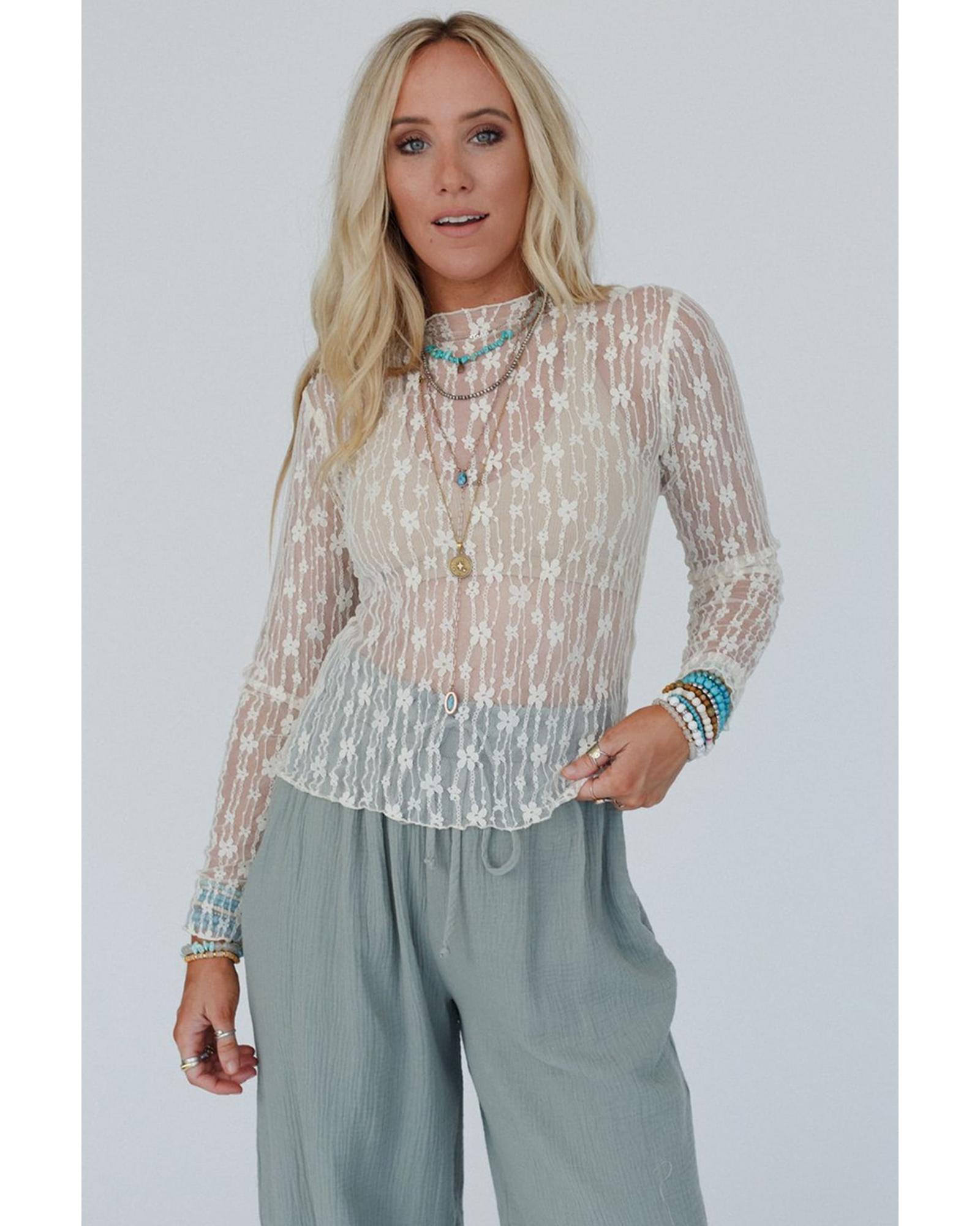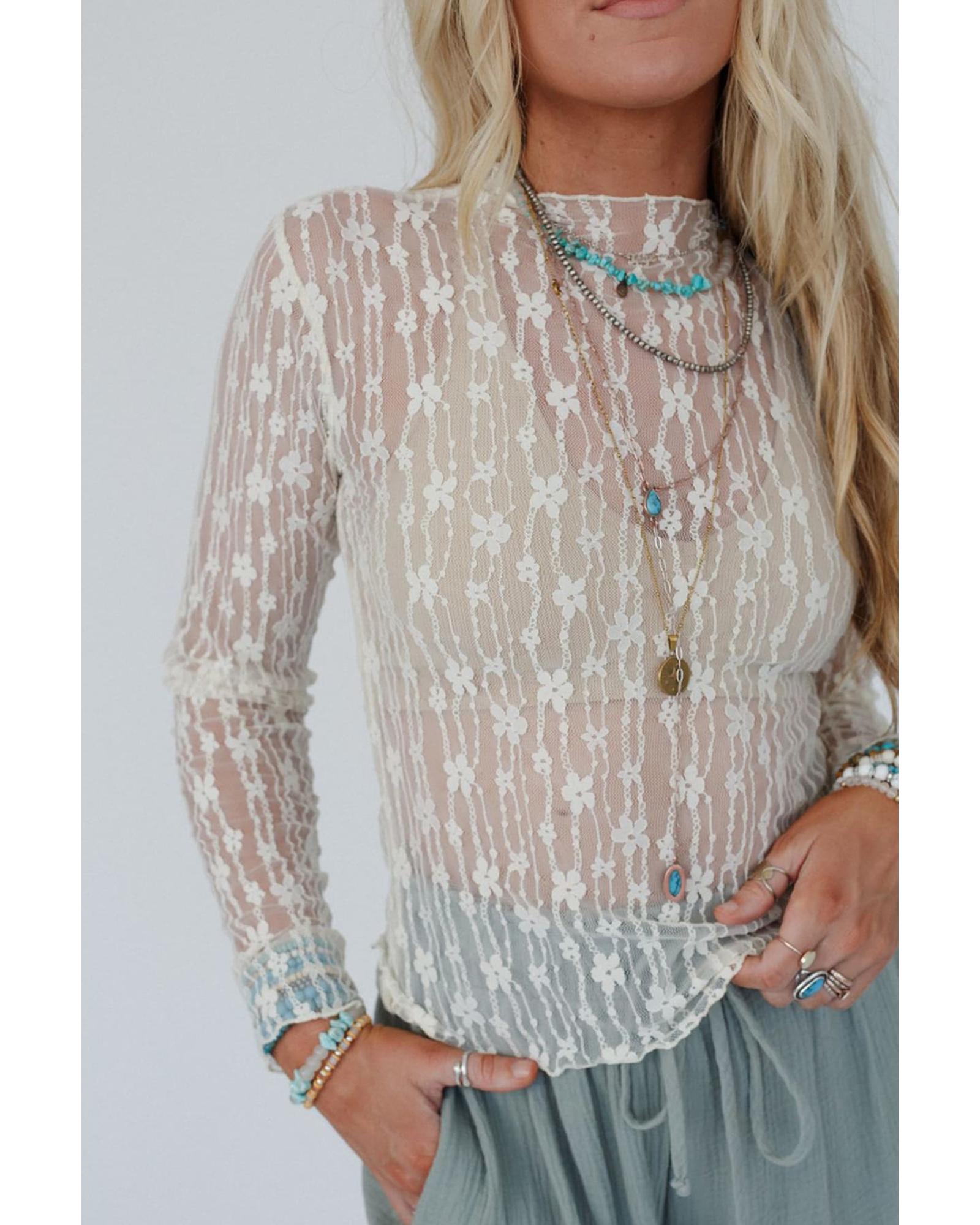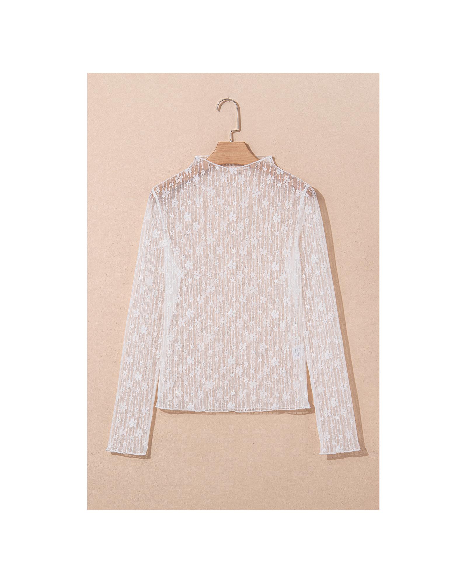 White Sheer Floral Lace Long Sleeve Slim Fit Top – M