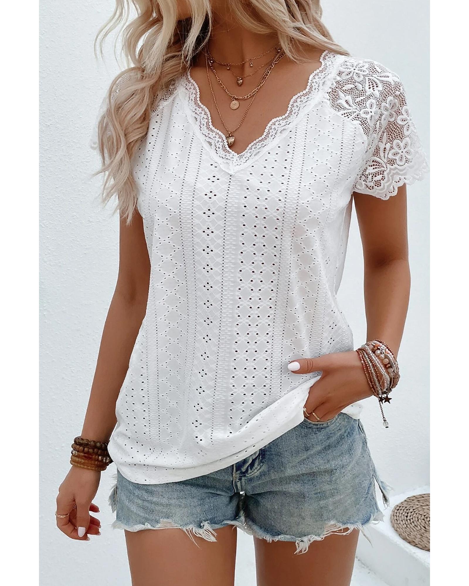 White Sheer Lace Short Sleeves Eyelet Embroidered Tee – S